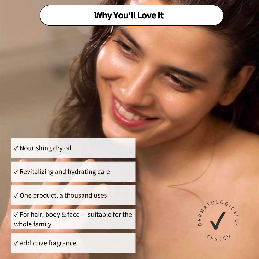 - Voor lichaam en gezicht: Breng de olie aan op het lichaam na het douchen voor extra hydratatie en zachtheid. Breng ook een kleine hoeveelheid aan op het gezicht na het reinigen voor een verzorgde en stralende huid.
