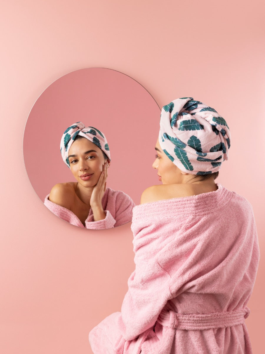 Een luxe, ultra-absorberende microvezel handdoekwrap met een tropische bladprint.