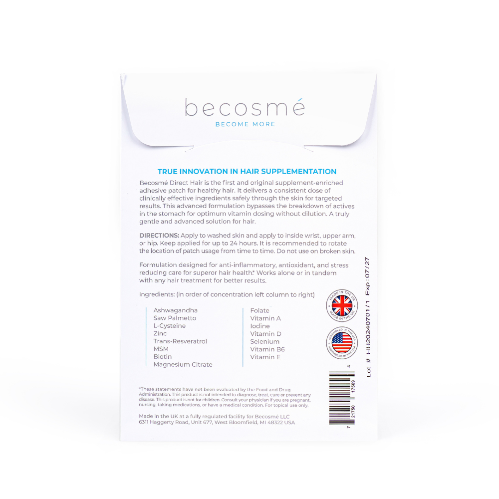 Wil je gezonder en voller haar zonder dagelijks pillen te slikken? Becosmé Direct Hair Patch biedt een revolutionaire oplossing met de eerste transdermale vitamine- en beauty-ingrediënten verrijkte pleister. Deze innovatieve methode zorgt voor een optimale opname van essentiële voedingsstoffen via de huid, waardoor je haar sterker en voller wordt zonder de nadelen van traditionele supplementen.