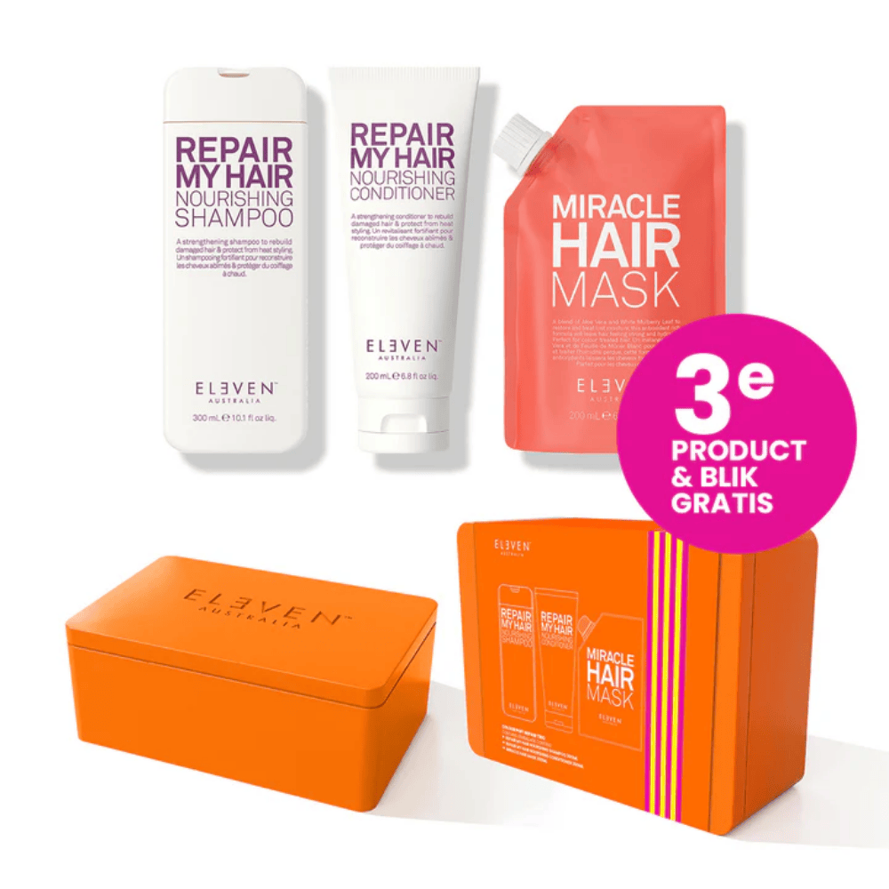 ELEVEN Australia Colour Pop Repair Trio is ideaal voor iedereen die op zoek is naar sterk en gezond haar, met extra bescherming tegen de hitte van stylingtools. Deze intens voedende set herstelt beschadigd haar van binnenuit en helpt het haar weer veerkrachtig, glanzend en glad te maken. Bij aankoop ontvang je het limited edition blik én het Miracle Hair Mask 200 ml t.w.v. €27,70 helemaal gratis. Het blik is volledig recyclebaar en het binnenwerk bestaat uit gerecycled afvalpulp en is volledig biologisch afbreekbaar.