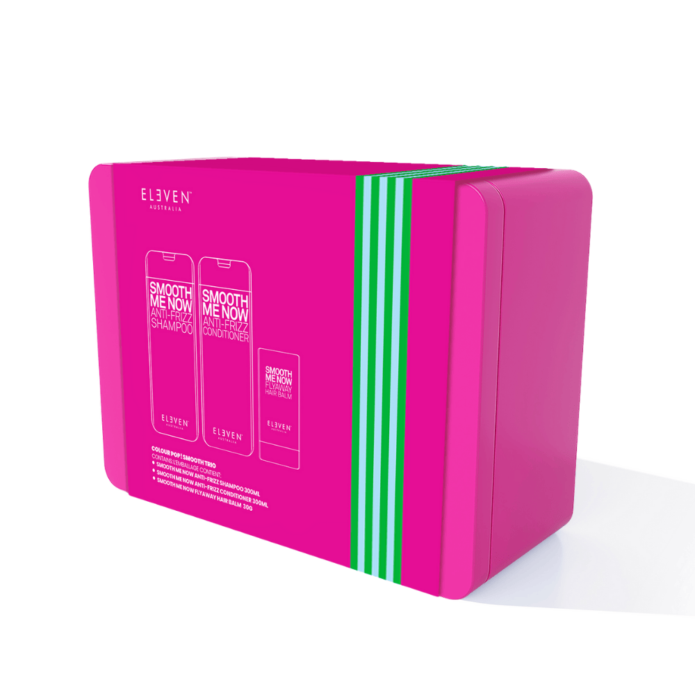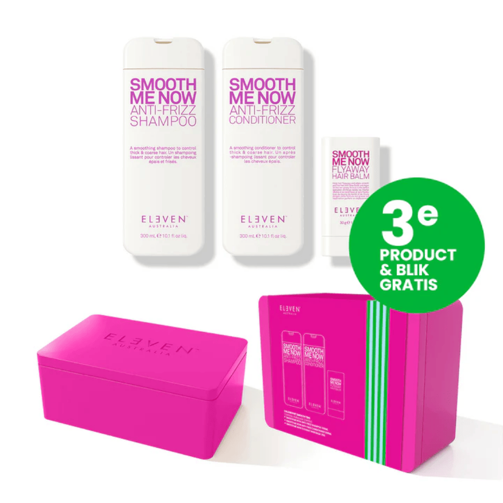 ELEVEN Australia Colour Pop Smooth Trio is ontwikkeld voor iedereen die droog, pluizig en broos haar wil transformeren naar zijdezacht, glad en glanzend haar. Deze intens gladmakende set voedt het haar diep, vermindert pluis en zorgt voor een prachtige, gezonde finish. Bij aankoop ontvang je het limited edition blik én de Smooth Me Now Flyaway Hair Balm 30 g t.w.v. €23,50 helemaal gratis. Het blik is volledig recyclebaar en het binnenwerk bestaat uit gerecycled afvalpulp en is volledig biologisch afbreekbaar. Miracle en Repair.