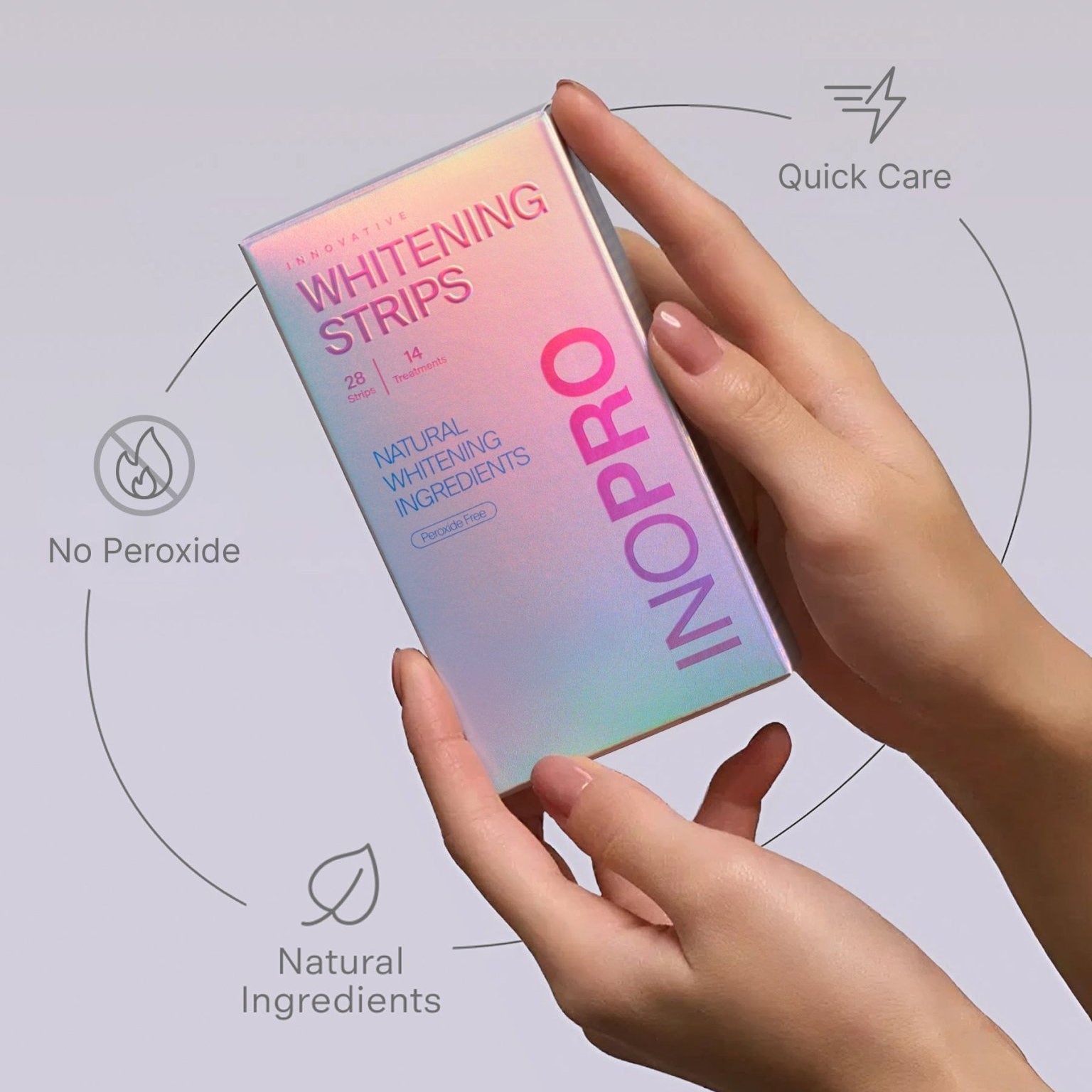 INOPRO Innovative Whitening Strips 14 Treatments bieden een zachte, maar effectieve manier om je tanden witter te maken zonder het gebruik van peroxide. Dankzij de natuurlijke enzymen papain en bromelain – afkomstig uit papaya en ananas – verwijderen de strips hardnekkige verkleuringen door koffie, thee en wijn, terwijl ze vriendelijk zijn voor het tandglazuur. De formule is alcoholvrij, SLS-vrij en speciaal ontwikkeld voor gevoelige tanden, zodat je veilig en comfortabel kunt genieten van een stralendere lach.