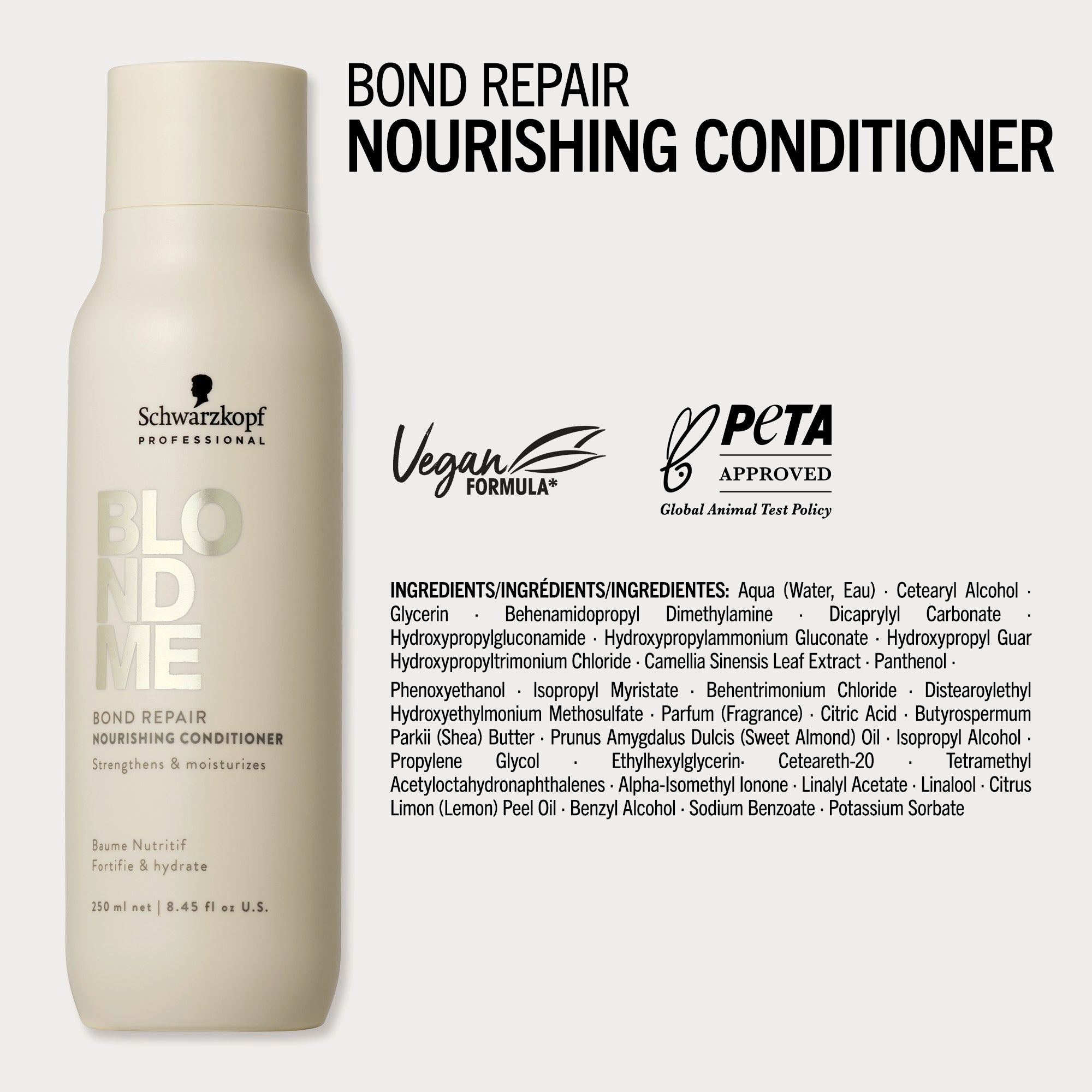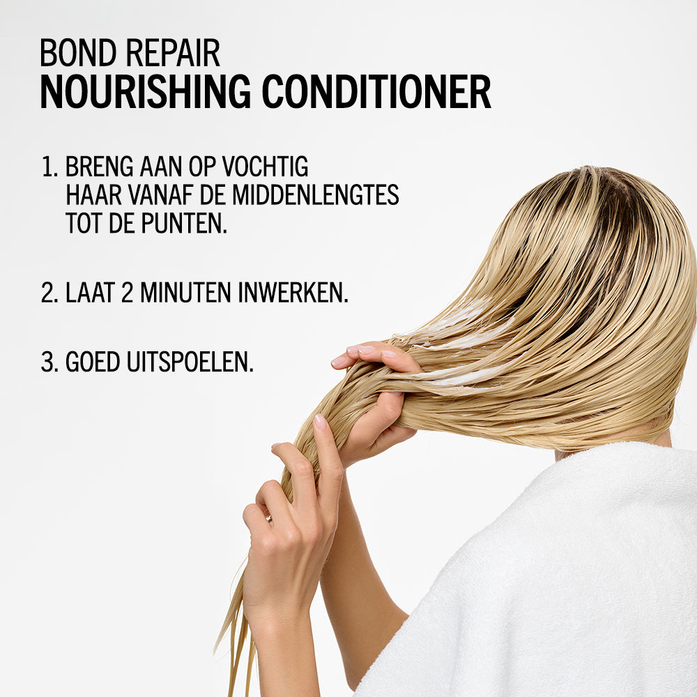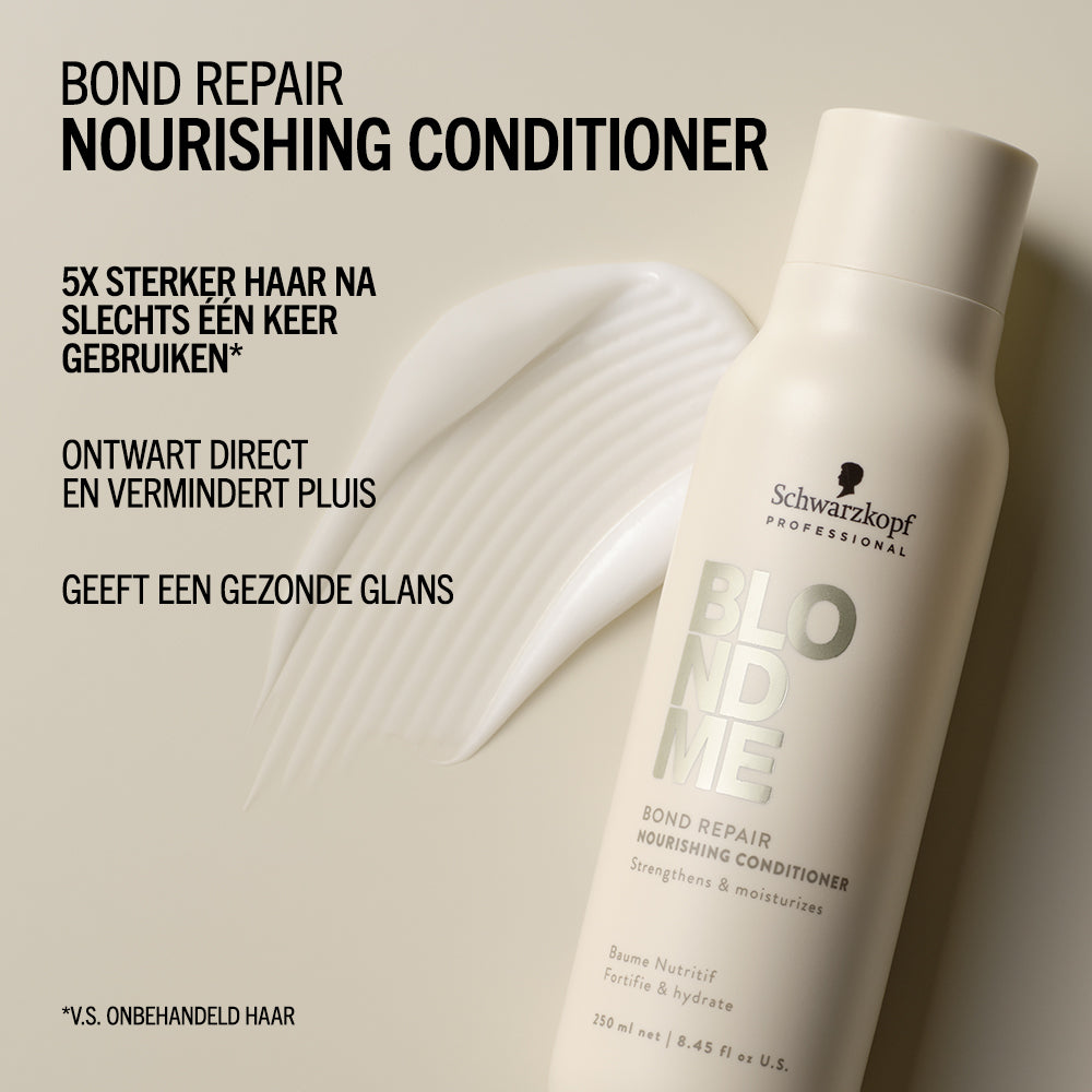BLONDME Bond Repair Nourishing Conditioner met BOND REPAIR TECHNOLOGY ontwart en voedt blond haar direct, zonder het te verzwaren. De hydraterende formule versterkt de haarstructuur door innerlijke haarverbindingen op te bouwen en herstelt schade die gelijk staat aan twee oplichtingsbehandelingen na slechts één gebruik. Verrijkt met amandelolie en witte thee, maakt deze conditioner het haar glad, vermindert pluizen en laat het soepel aanvoelen met een gezonde glans.