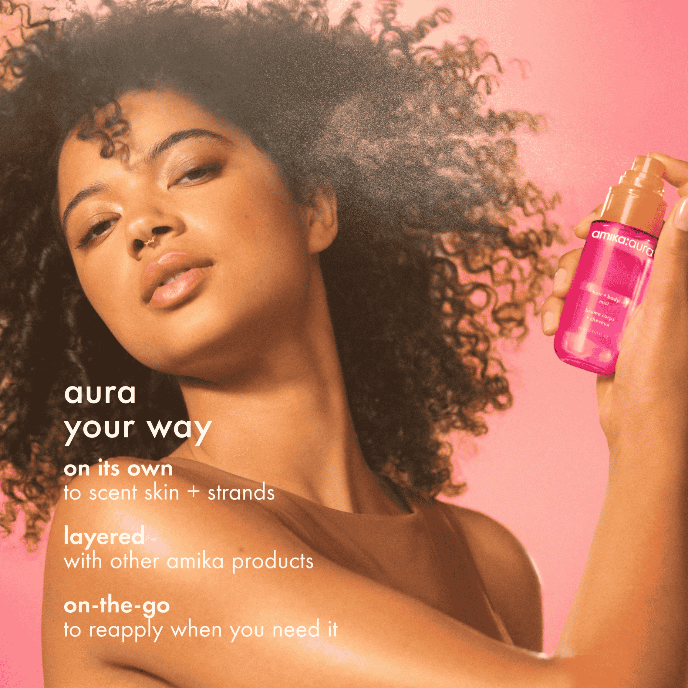 - Spray de amika aura hair and body mist op handdoekdroog of droog haar en op de huid voor een verfrissende geurboost.
