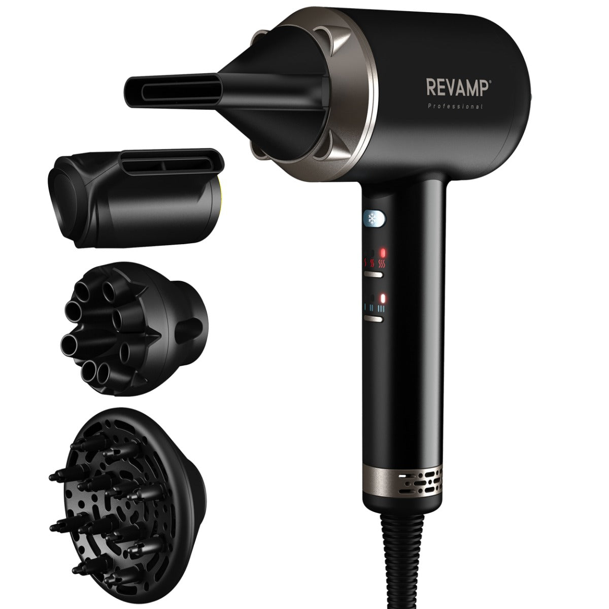 De bijgeleverde diffuser is doordrenkt met keratine, arganolie en kokosolie om je haar zijdezacht en gezond te houden. Met 4 verschillende warmtestanden en 3 snelheidsinstellingen kun je je haar naar wens drogen en stylen. De Revamp DR-7000 wordt geleverd met 4 magnetische mondstukken: een dun styling mondstuk van 6 mm voor gerichte styling en een gladmakend mondstuk van 7 mm voor een professioneel resultaat. Daarnaast wordt er ook een mondstuk meegeleverd voor meer volume genaamd de Fast dry & lift booster en een diffuser voor krullend haar.