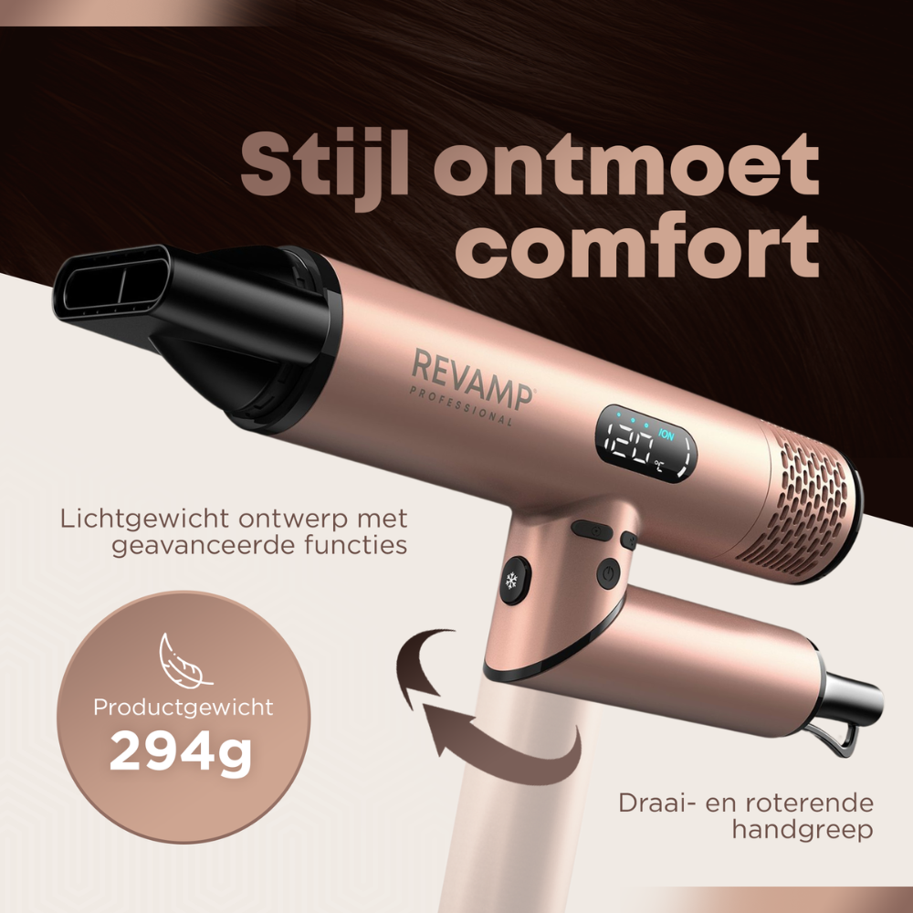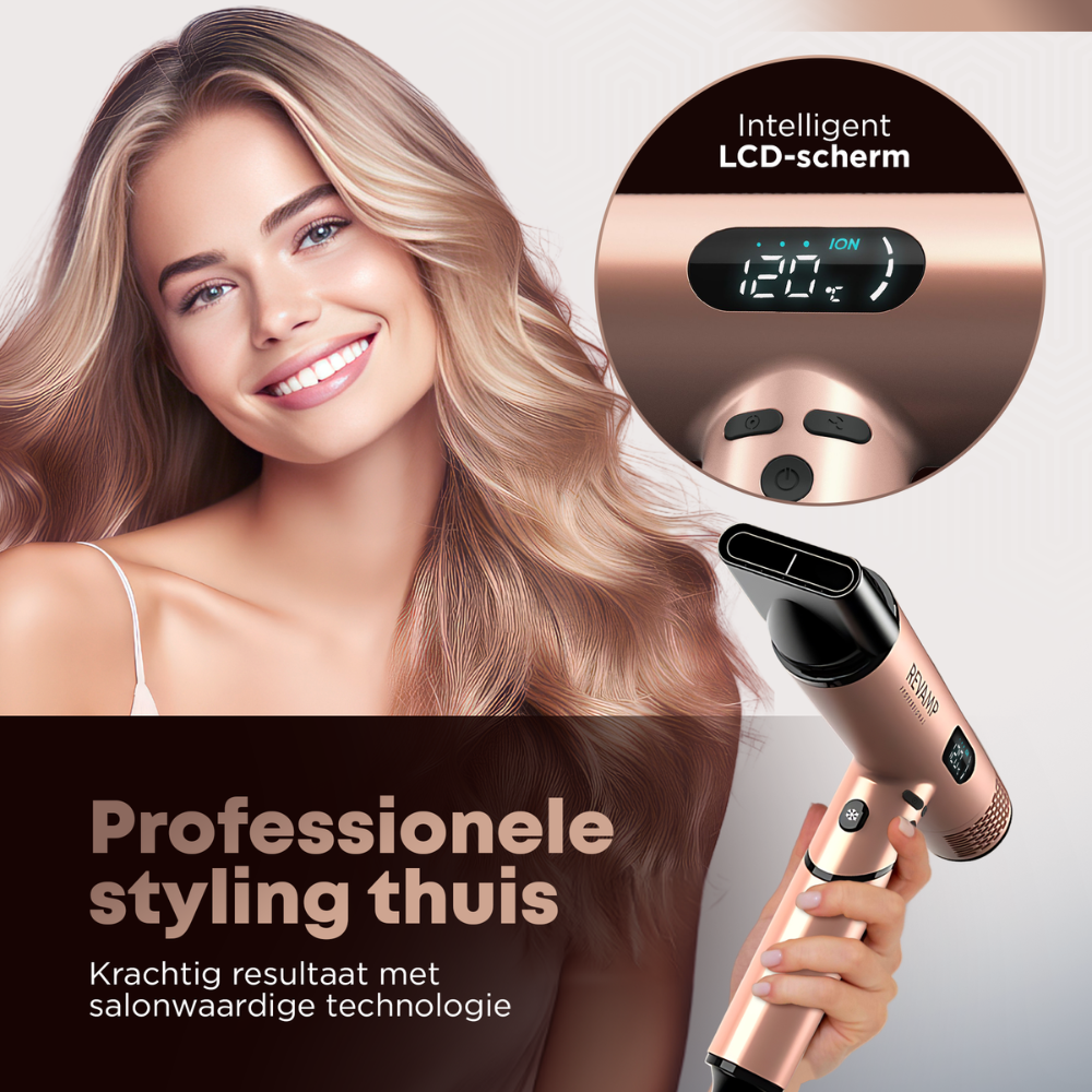 De Revamp DR-6400GD is geschikt voor elk haartype en biedt een reeks handige functies, waaronder magnetische opzetstukken voor veelzijdige styling en een inklapbaar ontwerp dat het apparaat perfect maakt voor zowel thuis als onderweg. Het LCD-display biedt controle met vier warmtestanden en drie snelheden, wat zorgt voor een gepersonaliseerde stylingervaring.