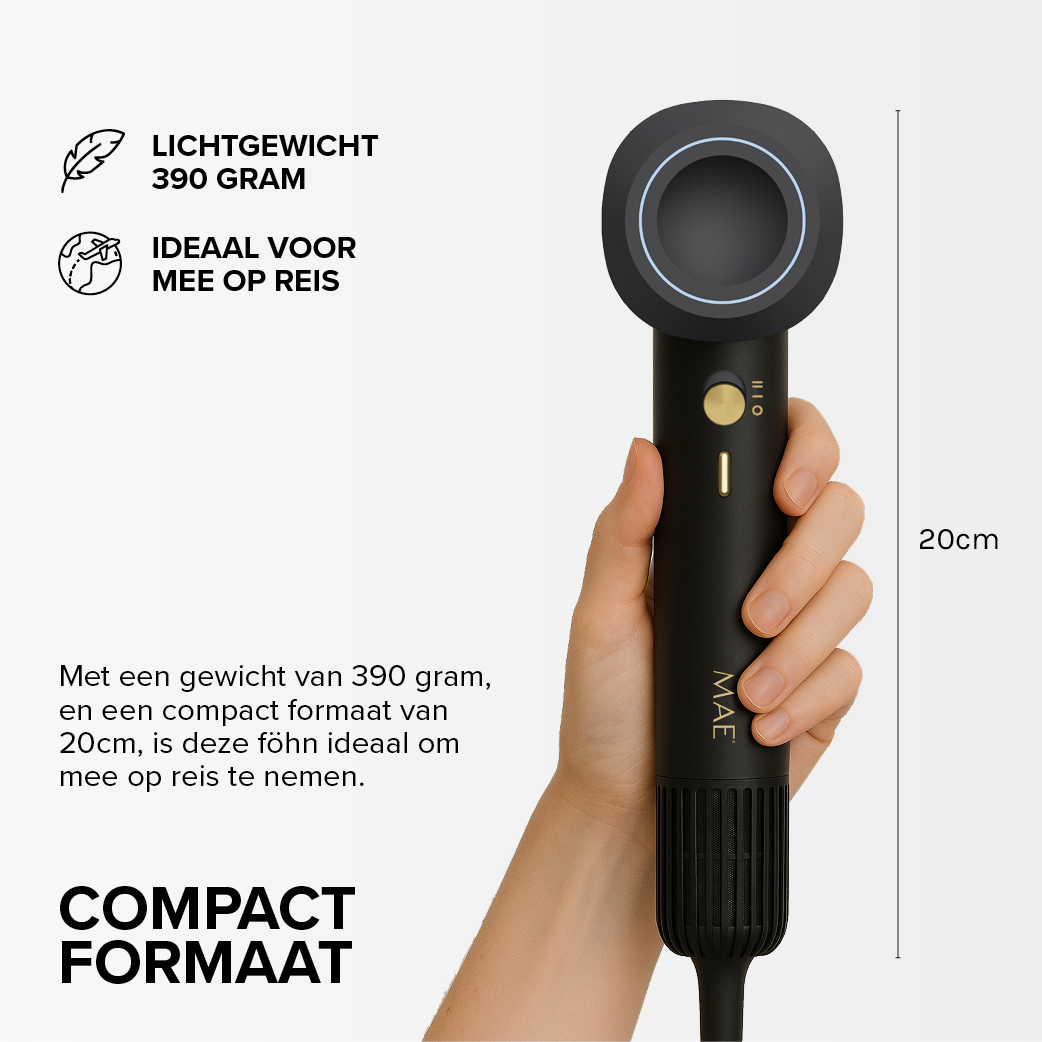 De MAE Breeze II is een compacte föhn met salonwaardige prestaties. Dankzij AI Heat Control wordt hittebeschadiging voorkomen en geniet je van pluisvrij, glanzend haar. Krachtig, lichtgewicht en ideaal voor thuis én onderweg.