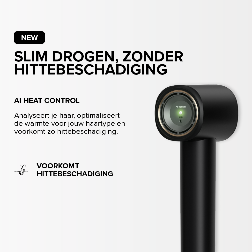 - Houd de föhn op een comfortabele afstand; de AI Heat Control past automatisch de temperatuur aan.