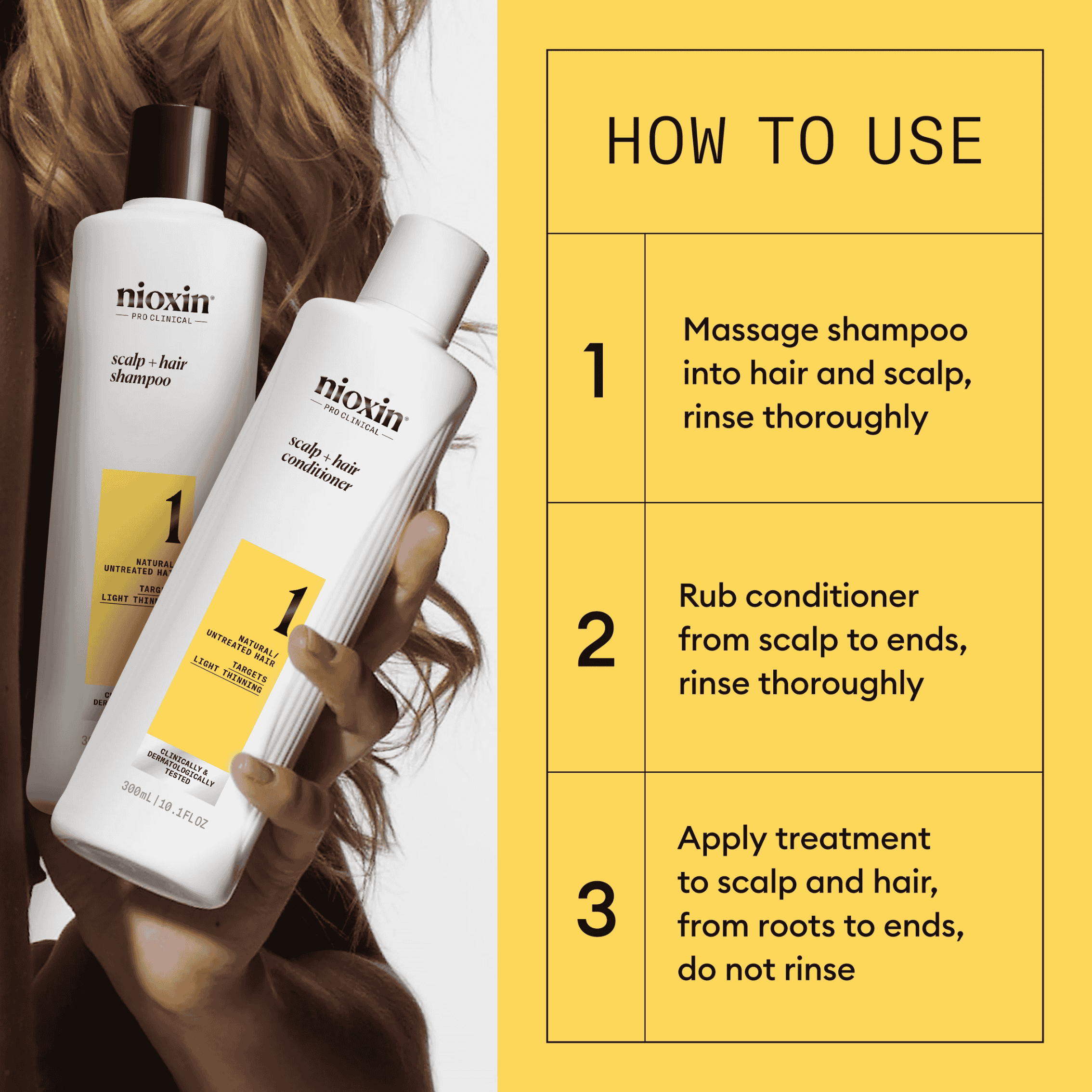 De Nioxin System 1 Trial Kit is geschikt voor mensen met natuurlijk dunner wordend haar. De set bevat een Cleanser Shampoo die talg, vuil en omgevingsresten verwijdert, een Scalp Therapy Conditioner die hydrateert en veerkracht geeft, en een Scalp & Hair Treatment die de hoofdhuid verfrist en dikker uitziend haar bevordert. Klinisch onderzoek toont aan dat deze set haaruitval door haarbreuk tot 91% kan verminderen**.