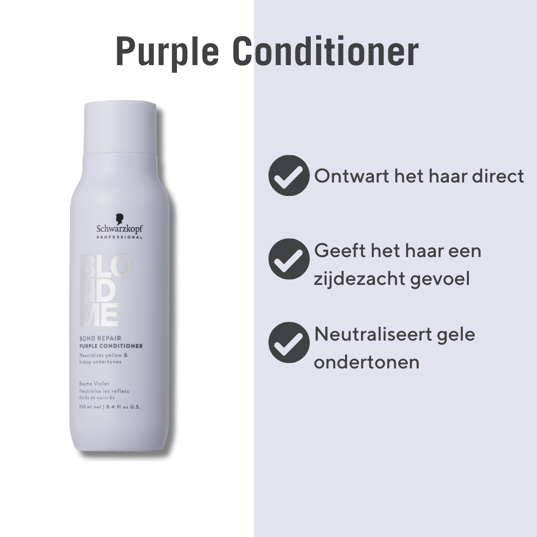 Schwarzkopf Professional BlondMe Bond Repair Purple Conditioner met BOND REPAIR TECHNOLOGY neutraliseert ongewenste gele ondertonen en helpt koperachtigheid te voorkomen. De intens verzorgende formule ontwart het haar direct en maakt het zijdezacht, zonder de haarkleur te veranderen. Verrijkt met amandelolie en korenbloem, voedt deze conditioner het haar en behoudt een frisse, koele blondtint. Daarnaast versterkt het de haarstructuur, vermindert haarbreuk tot 80%, en herstelt schade die gelijk staat aan twee oplichtingsbehandelingen na slechts één gebruik.