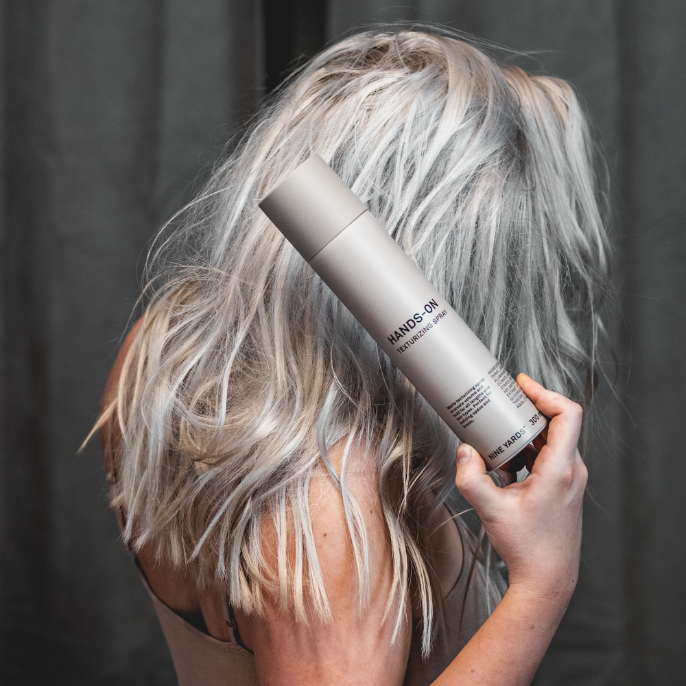 Nine Yards Hands-On Texturizing Spray is een veelzijdige textuurspray met een mat effect en medium hold. De spray geeft het haar direct volume en grip, zonder te verzwaren. Ideaal voor elke haarlengte en haartype om textuur op te bouwen, en perfect als basis voor updo’s, vlechten of een nonchalante look met extra body. 100% vegan, rijk aan natuurlijke ingrediënten en volledig vrij van parabenen, sulfaten en MIT.