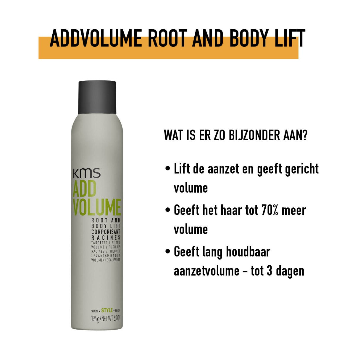 KMS California Addvolume Root & Body Lift zorgt ervoor dat het haar zichtbaar meer volume en body krijgt. Bij de haaraanzet wordt het haar opgelift waardoor het kapsel voller oogt en aanvoelt. Daarnaast heeft de Root & Body Lift een langdurige werking, het blijft maar liefst 3 dagen aanwezig. KMS California Addvolume Root & Body Lift is geschikt voor alle haartypen.