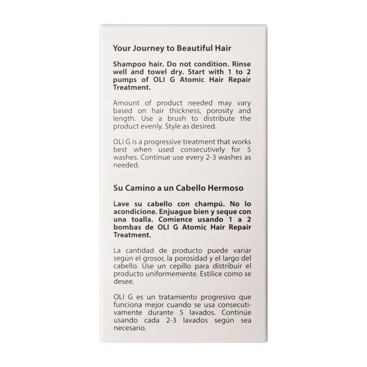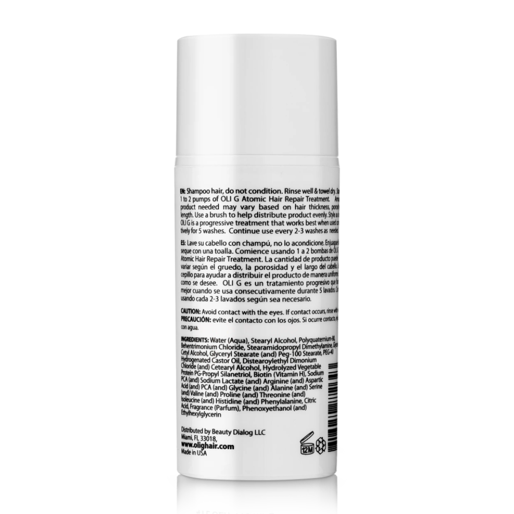 Oli G Atomic Hair Repair Treatment is een nieuw haarverzorgings- en beschermingsproduct dat beschadigd haar herstelt en repareert. Het is een collageen peptide complex met 11 parabeenvrije aminozuren, wat beschadigd, dof, gekleurd of kwetsbaar haar opnieuw gezond maakt. De wetenschappelijke formule kan schade binnen no-time herstellen, ongeacht de oorzaak of conditie van jouw haar. Oli G Treatment kan gebruikt worden voor of na kleuring, als masker of als leave-in conditioner. Het zorgt voor prachtig glad, zacht en glanzend haar zonder pluis. Gespleten haarpunten, dof, zwak en breekbaar zijn verleden tijd! Oli G is geschikt voor alle haartypes, waaronder extensions, daarnaast is het vrij van alcohol, parabenen, plastic, siliconen en sulfaten.