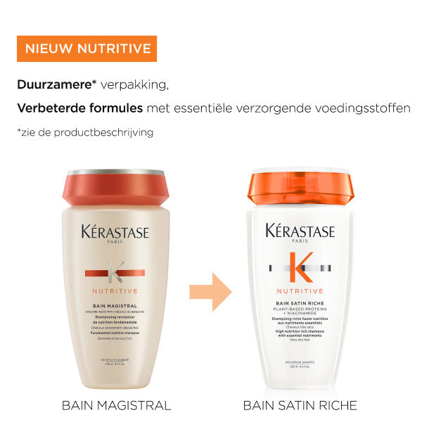 Nutritive Bain Satin Riche van Kérastase is een uiterst voedende shampoo voor zeer droog haar. Het bevat polymeren tegen uitdroging die intens voeden en kracht geven, waardoor het één van de beste shampoos is voor zeer droog haar. Bovendien bevat het essentiële verzorgende voedingsstoffen om droog haar te voeden en te versterken, met een luchtig resultaat. De sterk voedende formule reinigt intens en herstelt droog haar, terwijl ze vocht aanvult en comfort geeft. Bain Satin Riche heeft een witte smeuïge geltextuur en schuimt wrijvingsloos, waardoor het één van de beste shampoos is voor een jeukende hoofdhuid en voor zeer droog haar, met een heerlijk bloemig parfum.