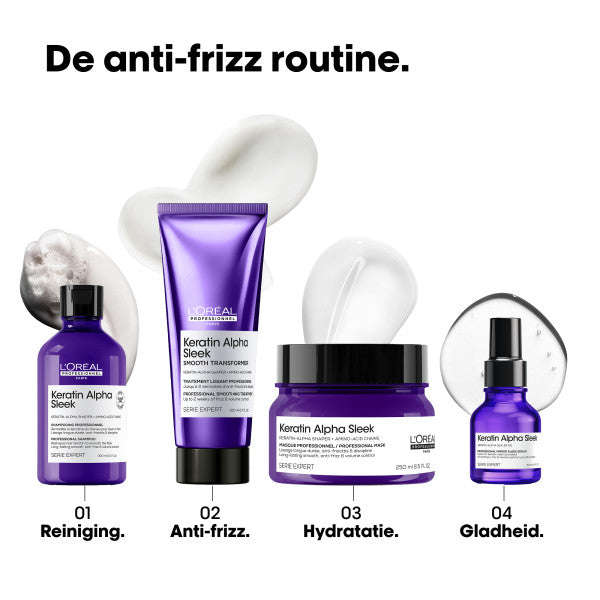 - Gebruik wekelijks de Keratin Alpha Sleek Smooth Transformer en wissel af met het Keratin Alpha Sleek Haarmasker op overige wasdagen
