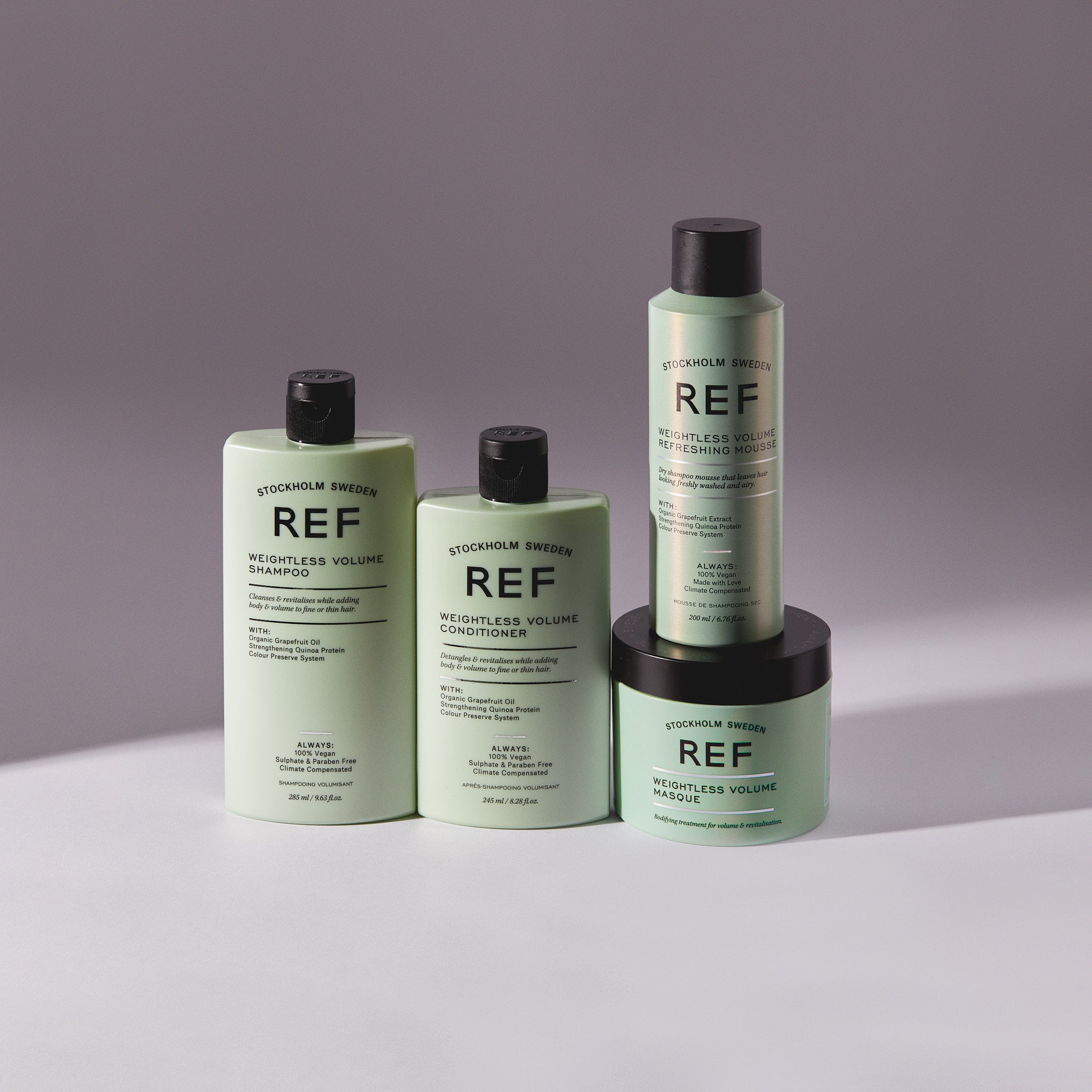 REF Weightless Volume Shampoo reinigt het haar op een grondige maar toch milde manier dankzij de natuurlijke ingrediënten. Zo bevat de shampoo onder andere extracten van witte moerbeibladeren en vlaszaad, maar ook arganolie en tamanu olie. De shampoo is verzorgend en revitaliserend. Hierdoor zullen delen in het haar worden gelift en krijgt het haar een mooie volumeboost. Het volume wordt vastgehouden, wat zorgt voor een langdurig model in het haar. REF Volume Shampoo is vrij van parabenen en sulfaten.