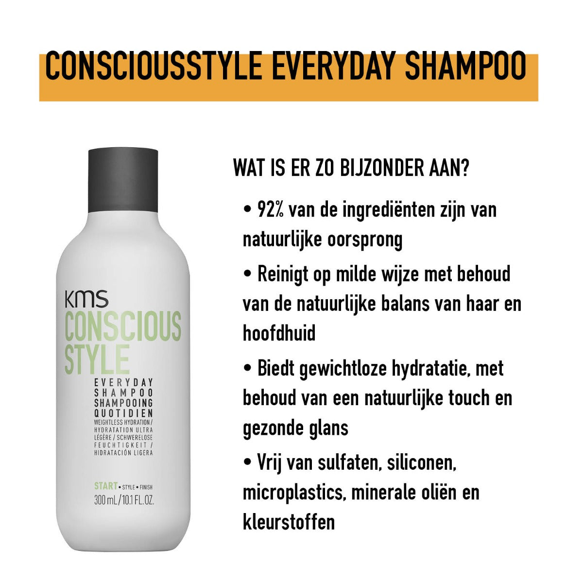 KMS CONSCIOUS STYLE EVERYDAY SHAMPOO beschermt het haar en laat het haar zijn natuurlijke touch en gezonde glans behouden. Het haar wordt op een milde manier gereinigd en is speciaal voor medium tot fijn haar. De formule van dit product geeft een gewichtloze hydratatie aan het haar terwijl de natuurlijke textuur terugkomt. Ook beschermt deze shampoo het haar tegen milieuverontreinigende stoffen. De shampoo is door de zachte formule geschikt voor dagelijks gebruik. 92% van de ingrediënten zijn van natuurlijke oorsprong.