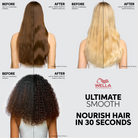 Wella Professionals Ultimate Smooth Shampoo is een zachte en effectieve shampoo die je haar detoxeert van schadelijke metalen dankzij de speciale Metal Purifier-technologie. De shampoo is verrijkt met Squalaan en Omega-9, die het haar van binnenuit voeden en van buiten herstellen. De shampoo is dermatologisch getest en geschikt voor gekleurd haar. Daarnaast heeft het een aangename bloemige geur met tonen van jasmijn, vanille, bergamot, perzik en sandelhout.