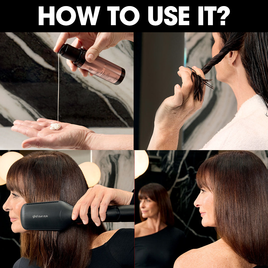 - Activeer de verzorging met warmte: droog het haar volledig en gebruik een verwarmde ghd tool om de werking te maximaliseren.