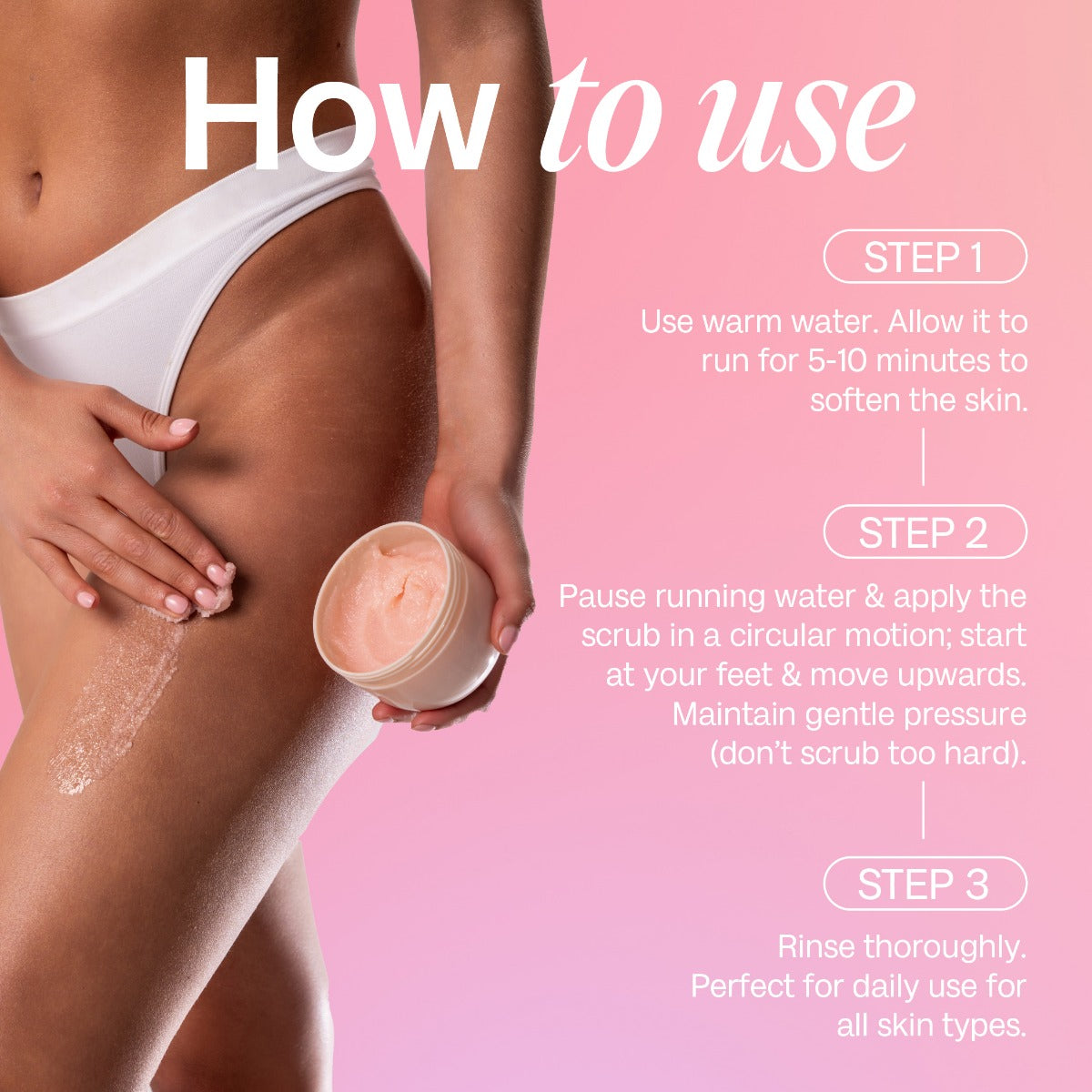 Met een scrub verwijdert u dode huidcellen doormiddel van grove korreltjes die zijn verwerkt in het product. Door met licht roterende bewegingen het product op het gezicht, voet of lichaam aan te brengen verwijdert u zelf handmatig de dode huidcellen. Bij het gebruiken van een scrub is het ook mogelijk om gebruik te maken van een scrubhandschoen. Let op dat u online goed kijkt naar voor welk lichaamsdeel de scrub is, een scrub voor het lichaam is namelijk een stuk agressiever dan een scrub voor het gezicht. Deze scrub van Zarqa is bijvoorbeeld speciaal voor de voeten.