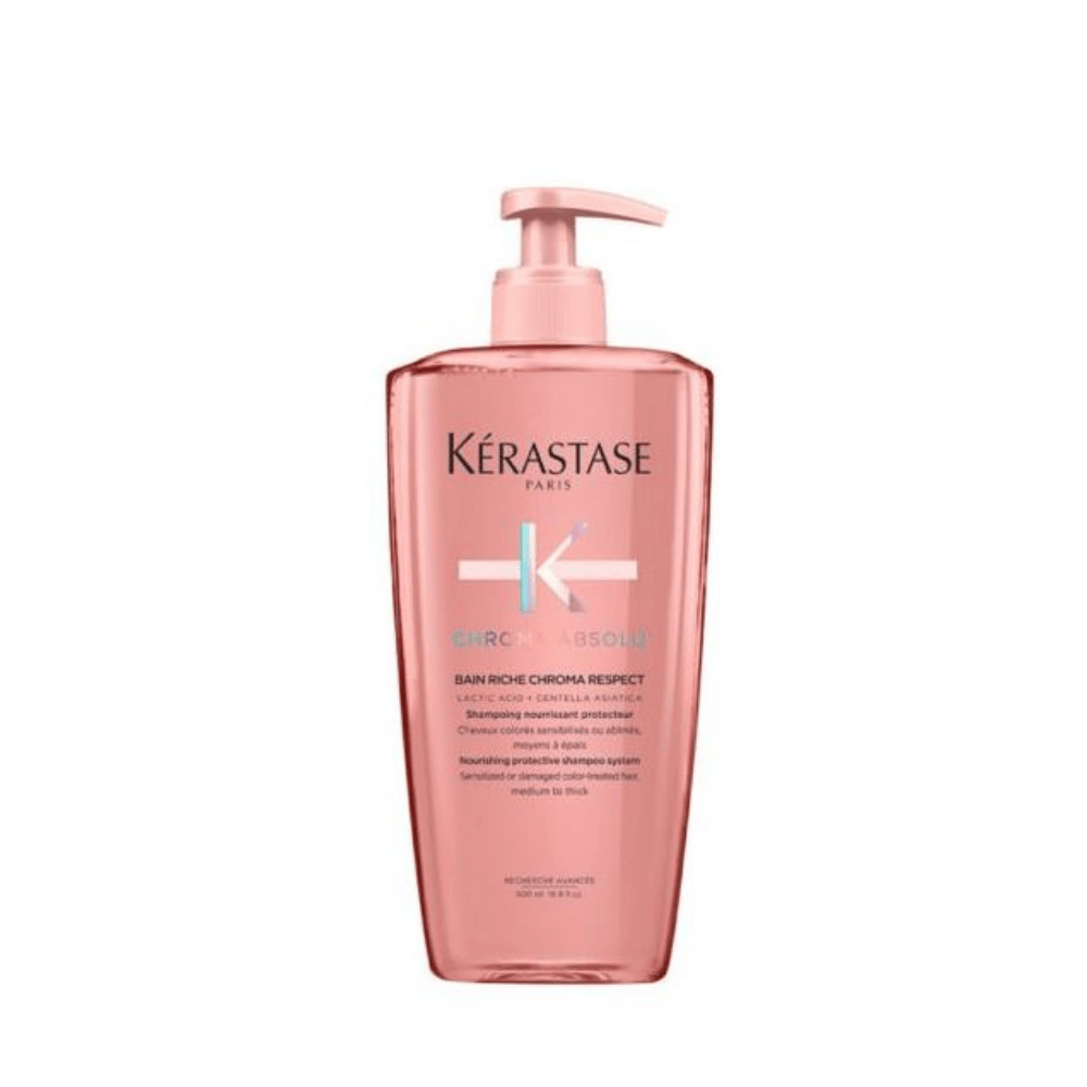 Kérastase Chroma Absolu Bain Riche Chroma Respect is een kleurbeschermende shampoo met melkzuur voor elk type gevoelig of beschadigd, medium tot dik gekleurd haar. Deze lichtroze, transparante en rijke gelformule reinigt en voedt het haar intensief en beschermt tegen vervaging van de kleur. Kérastase Chroma Absolu Bain Riche Chroma Respect vermindert haarbreuk en pluis en maakt het haar heerlijk zacht.