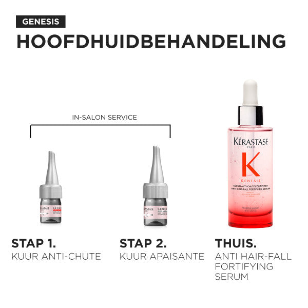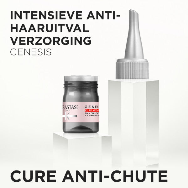 Kérastase Genesis Cure Anti-Chute is een intensieve anti-haaruitval kuur, speciaal ontwikkeld voor mannen en vrouwen met normaal haar dat gevoelig is voor haaruitval. Deze 6-weken behandeling versterkt de haarvezel, verbetert de kwaliteit van de hoofdhuid en helpt het haar stevig te verankeren, zodat het minder snel uitvalt.