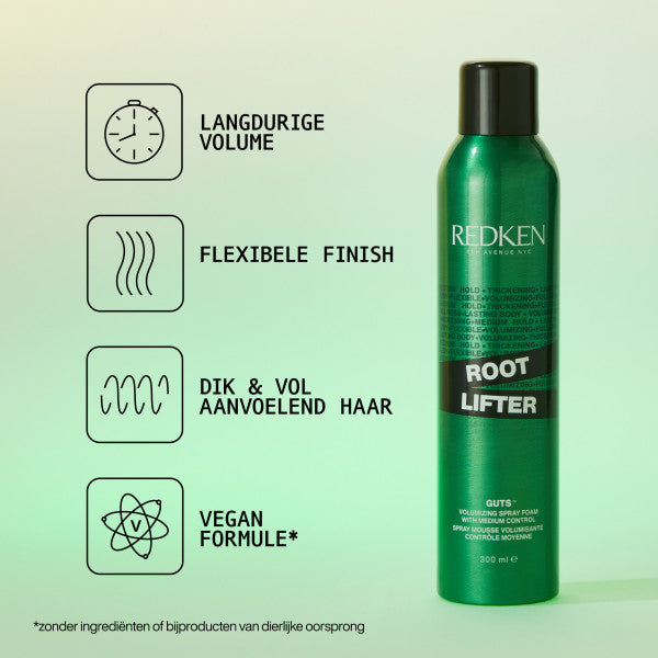 De Redken Root Lifter 300 ml is een medium hold Mousse Spray die bij zowel de aanzet, lengte en punten volume creëert. Het geeft het haar een boost en volume voor een gewaagde look. De spray maakt het mogelijk om het product nauwkeurig aan te brengen voor volume bij de aanzet of op het gehele kapsel.