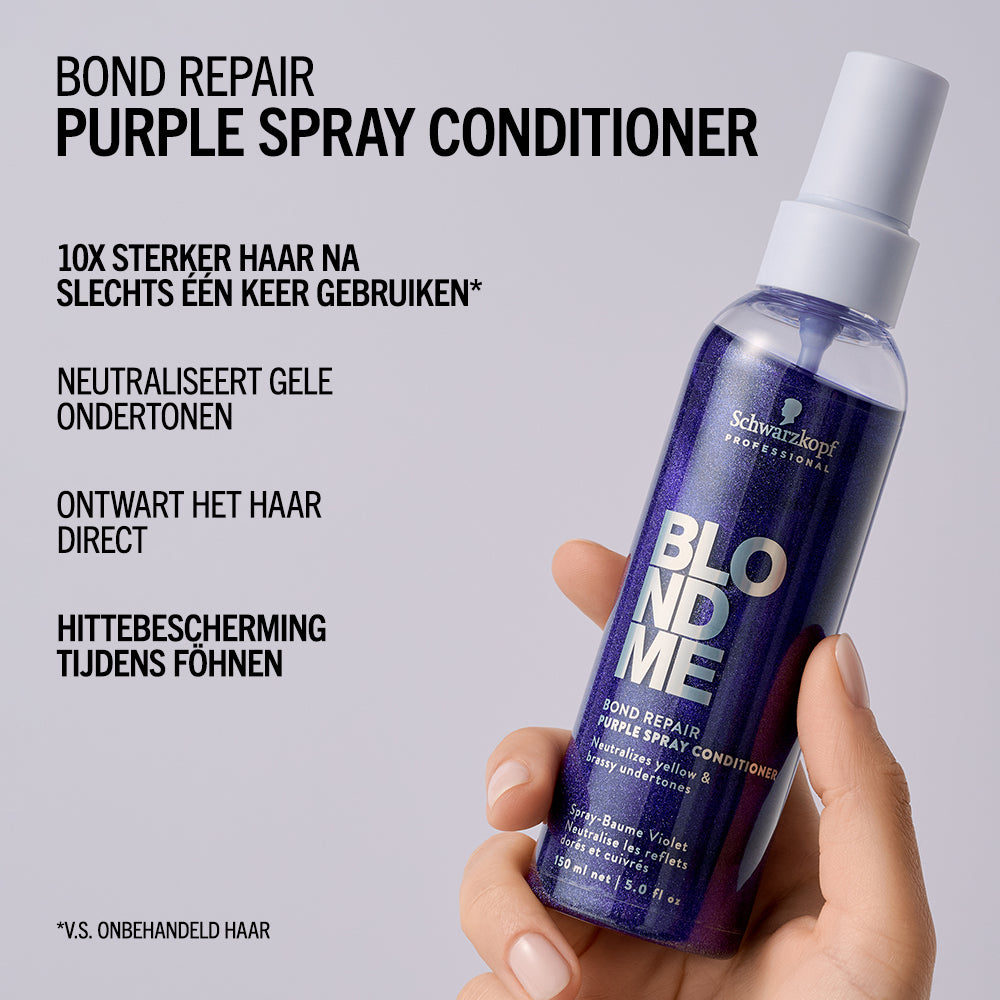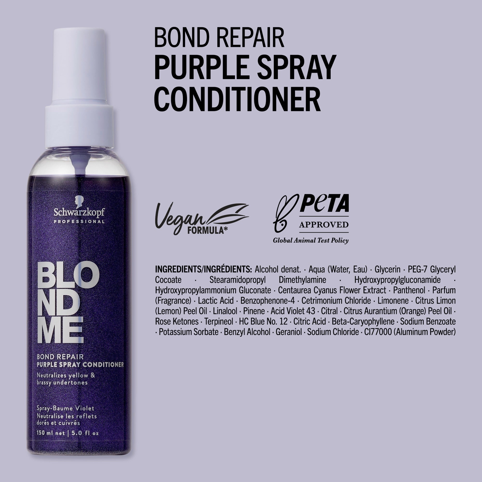 Schwarzkopf Professional Bond Repair Purple Spray Conditioner met BOND REPAIR TECHNOLOGY neutraliseert ongewenste gele ondertonen en voorkomt een koperachtige gloed. De lichte, niet-verzwarende formule ontwart het haar direct en laat een prachtige, zilveren glans achter. Verrijkt met amandelolie en korenbloem, voedt het de lokken en behoudt het een frisse, koele tint zonder de haarkleur te veranderen.