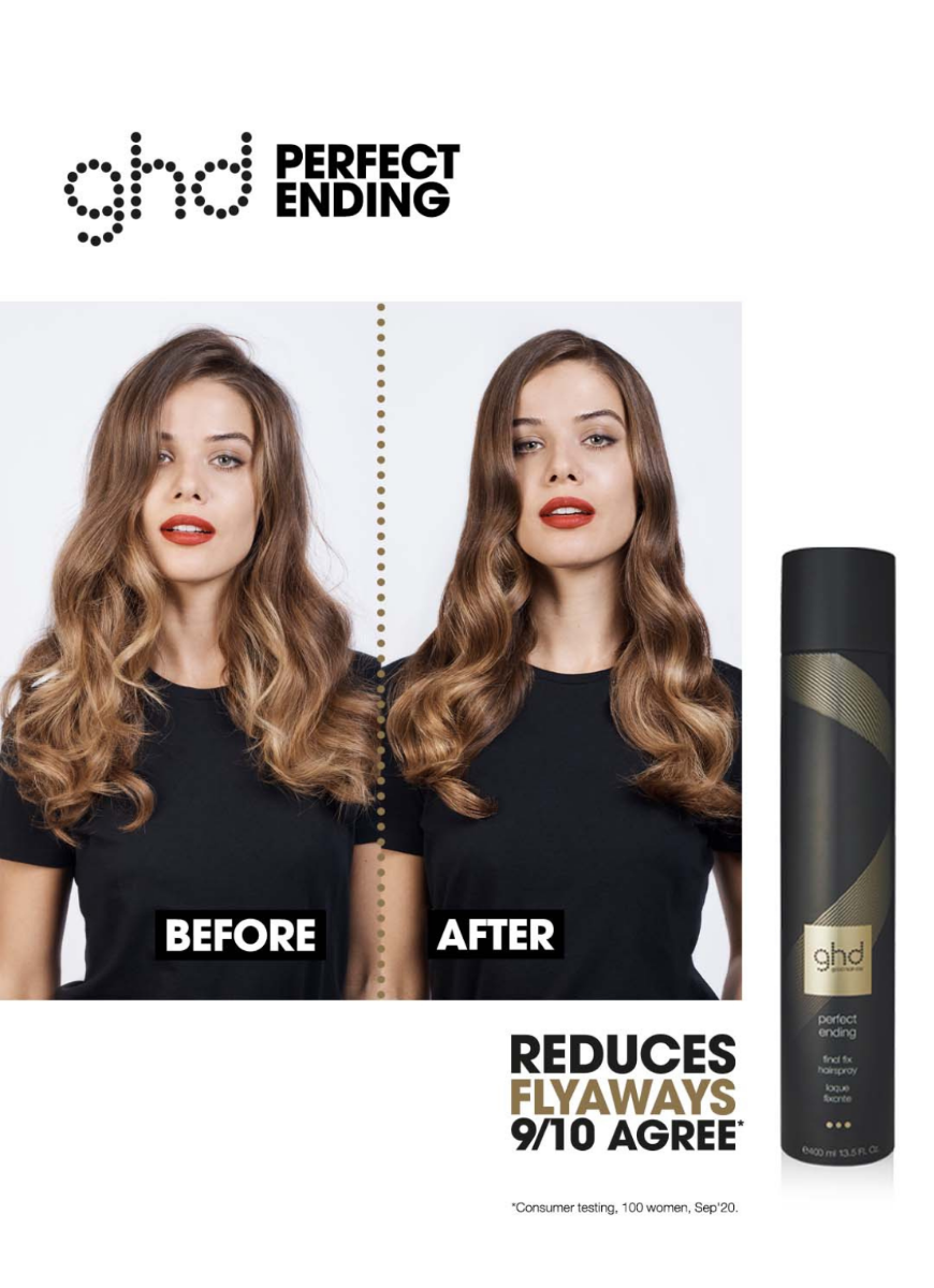 Deze spray is ideaal voor iedereen die onderweg is en zijn of haar stijl wil behouden. De GHD Perfect Ending Spray is geschikt voor alle haartypes en zorgt voor een zacht, zijdeachtig resultaat zonder het haar te verzwaren. Het biedt een optimale bescherming tegen vocht en is gemakkelijk uit te borstelen, perfect voor dagelijks gebruik samen met andere ghd stylingproducten.