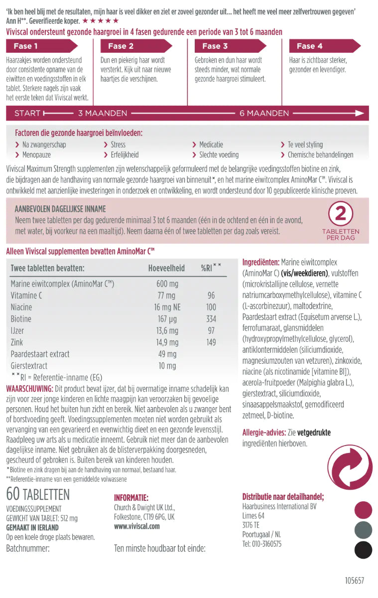 Deze klinisch bewezen formule is verrijkt met het exclusieve AminoMar® Marine Complex, gecombineerd met essentiële vitamines en mineralen van natuurlijke oorsprong. Deze unieke mix voedt het haar van binnenuit, versterkt de haarzakjes en ondersteunt een gezonde haargroeicyclus – voor zichtbaar resultaat in slechts 3 tot 6 maanden.