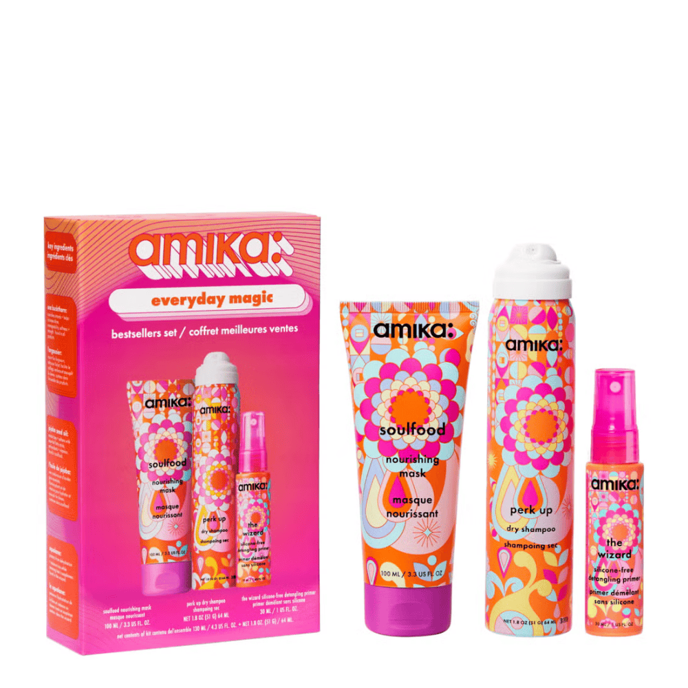 Ontdek de kracht van amika Everyday Magic Bestsellers Set, een trio van mini’s die samen zorgen voor moeiteloze, gezonde en glanzende lokken. Deze set bevat drie favorieten die je haar verzorgen van voorbereiding tot finish: prime, nourish en refresh. Geschikt voor alle haartypes en -texturen, verrijkt met duindoornextract voor intensieve hydratatie en een zijdezachte, soepele finish die klaar is voor elke stylingronde.