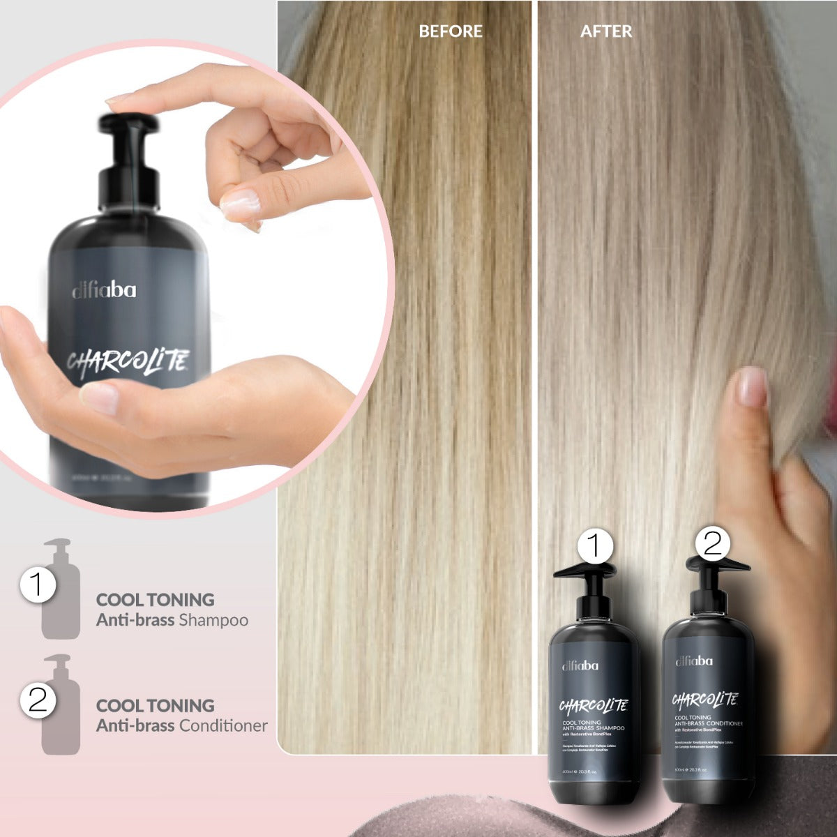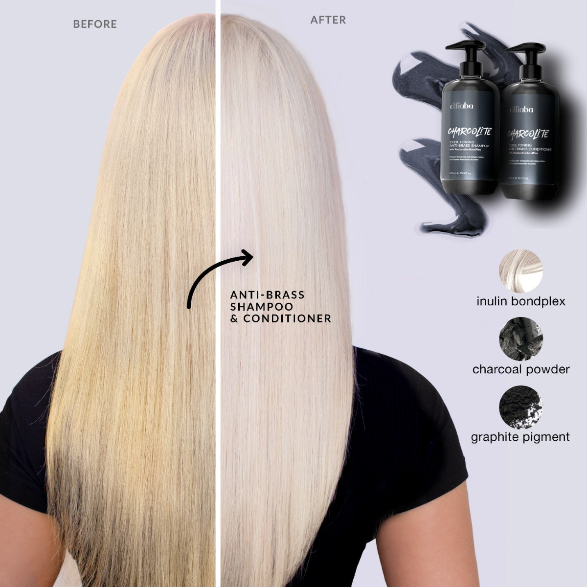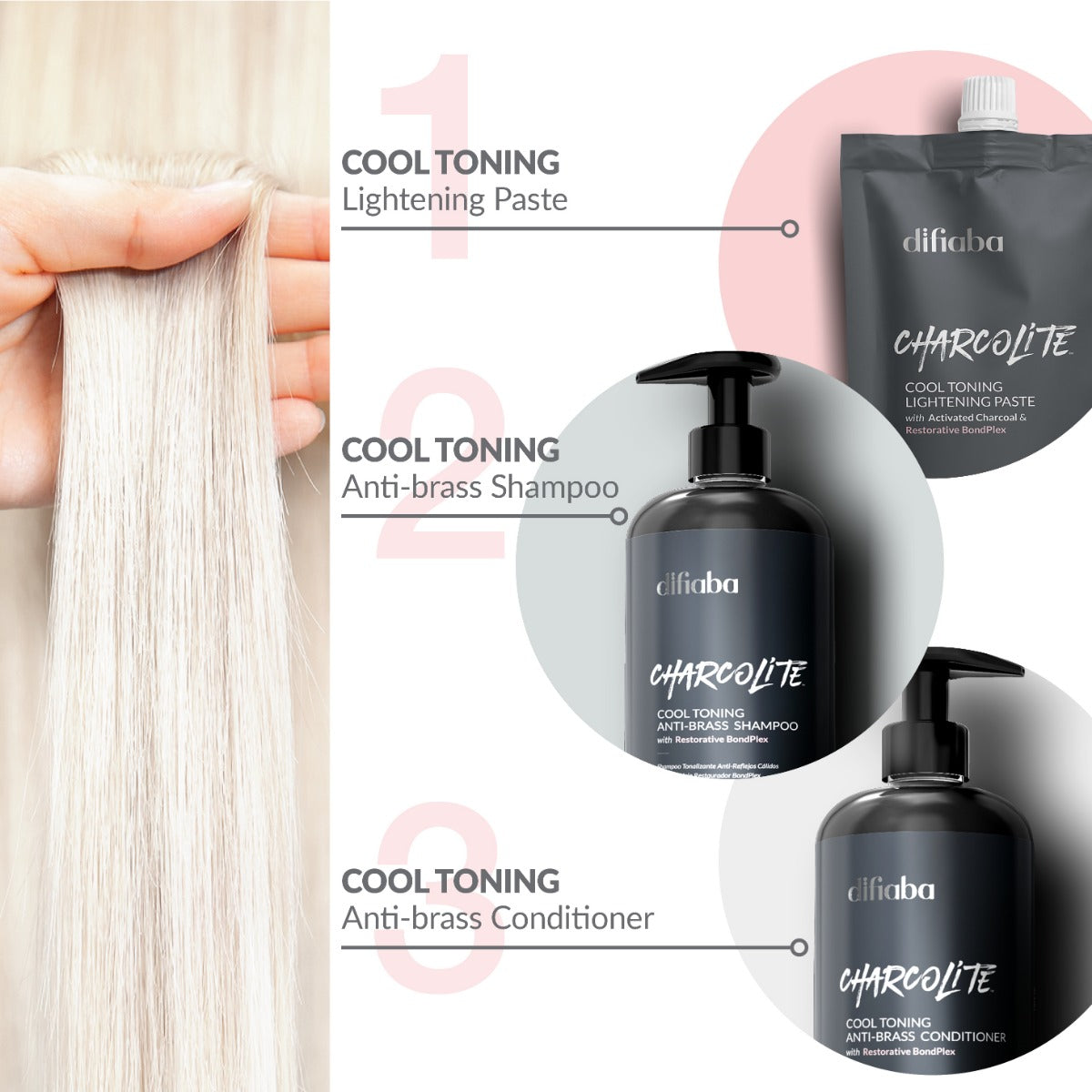 Difiaba Charcolite Cool Toning Anti-Brass Conditioner elimineert gele en koperachtige tinten in alle blonde tinten. De Charcolite Conditioner bevat natuurlijke grafietpigmenten die het haar een perfecte, gezonde, blonde tint te geven. Of je nu van jezelf blond haar hebt, highlights, balayage of je haar sterk bewerkt is, je kunt de blonde niveaus zelf kiezen.