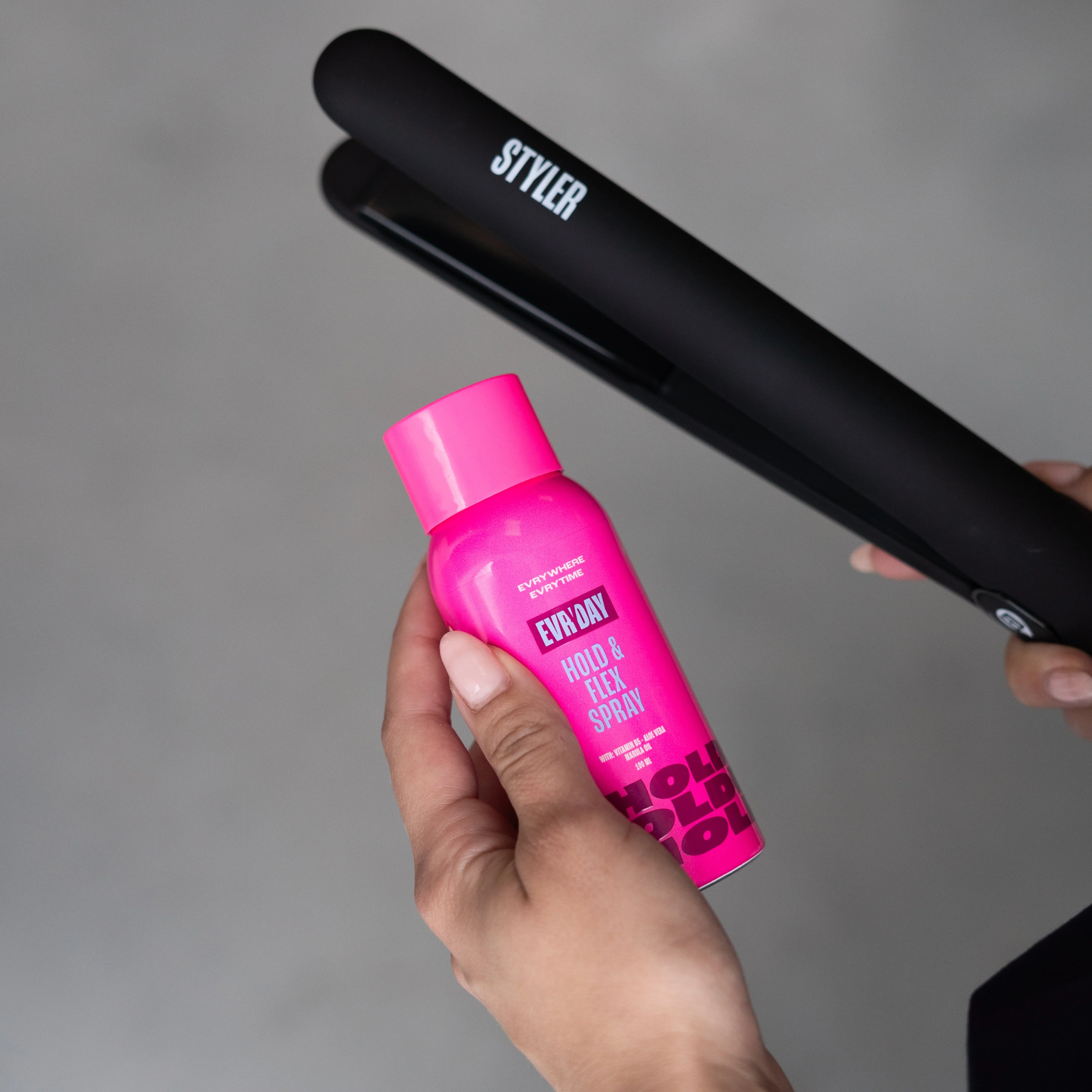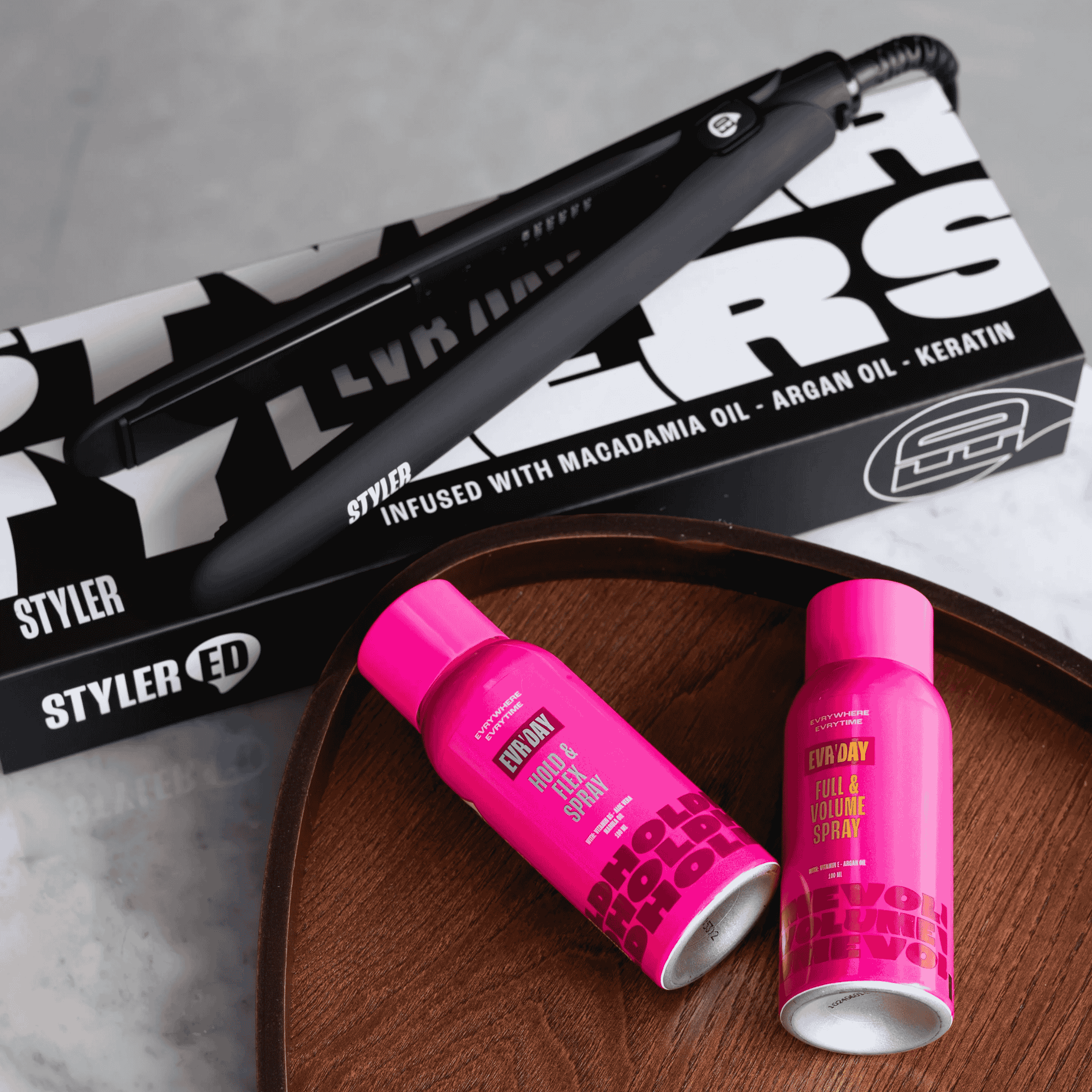 De Evryday – Full & Volume Spray is het ultieme geheim voor een volumineuze look! Dankzij de toevoeging van arganolie wordt je haar niet alleen voller maar ook opmerkelijk zachter en veerkrachtiger. Ongeacht je haartype, deze spray biedt een sterke fixatie zonder zwaar aan te voelen. Evryday – Hold & Flex Spray is een alledaagse haarlak die een perfecte balans heeft tussen flexibiliteit en hold. De formule, verrijkt met Aloë Vera en Marula-olie, houdt je haar soepel en makkelijk doorkambaar.