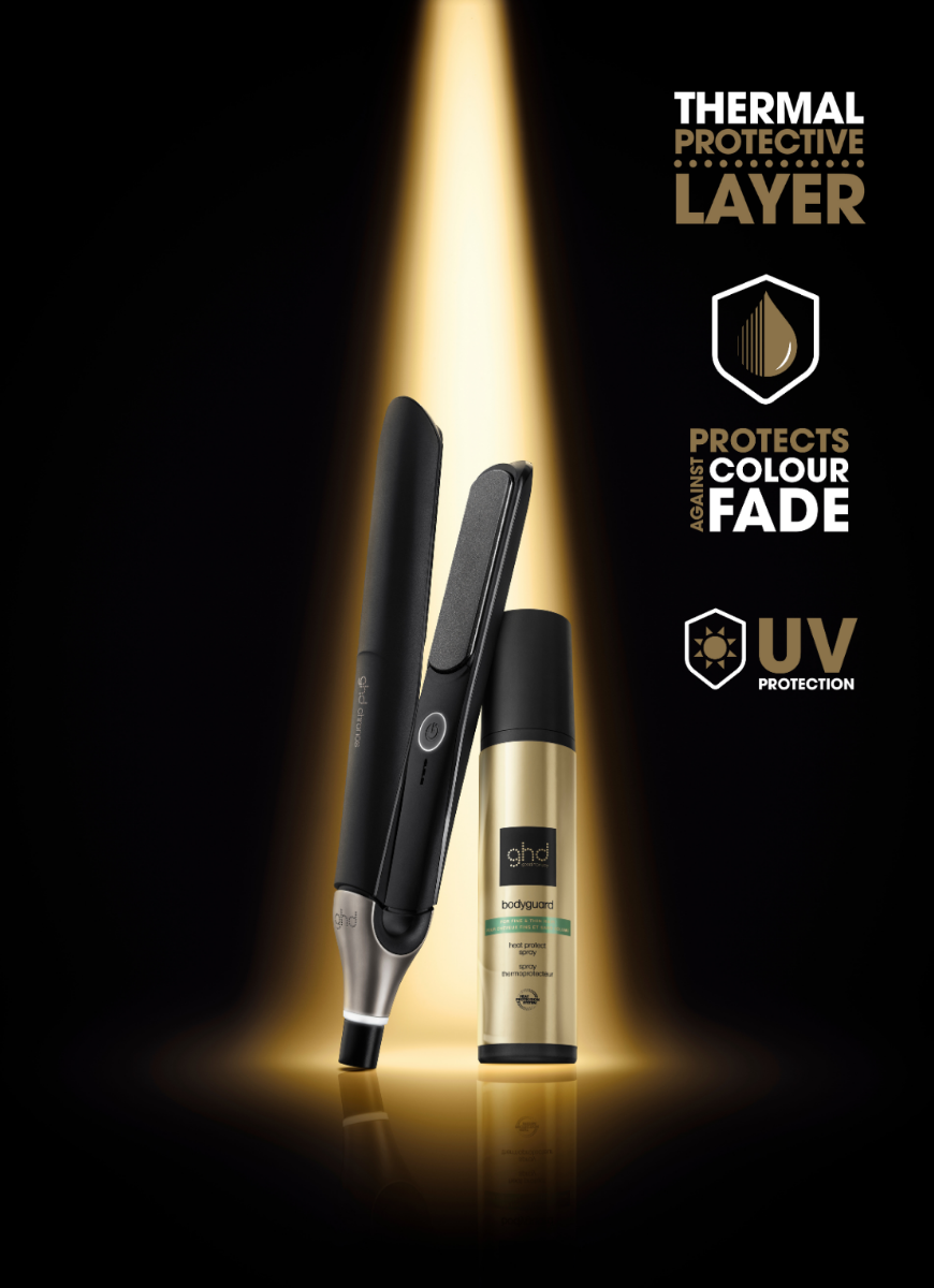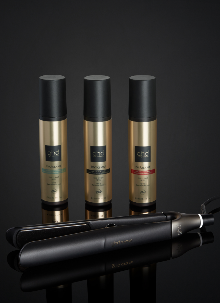 - Spray ghd bodyguard gelijkmatig van de haaraanzet tot de punt, op zowel nat als droog haar.