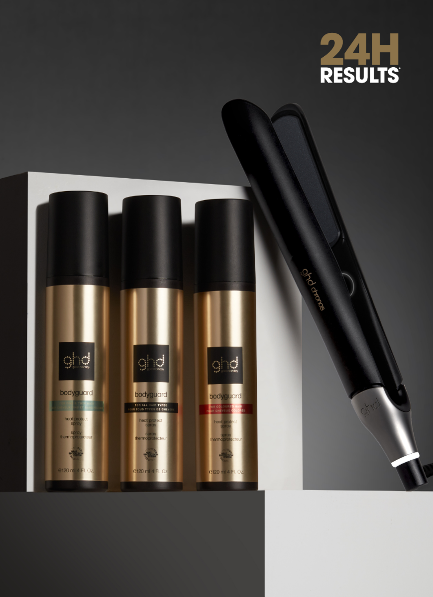 - Spray ghd bodyguard heat protection op droog haar en verdeel het met de ghd borstel.