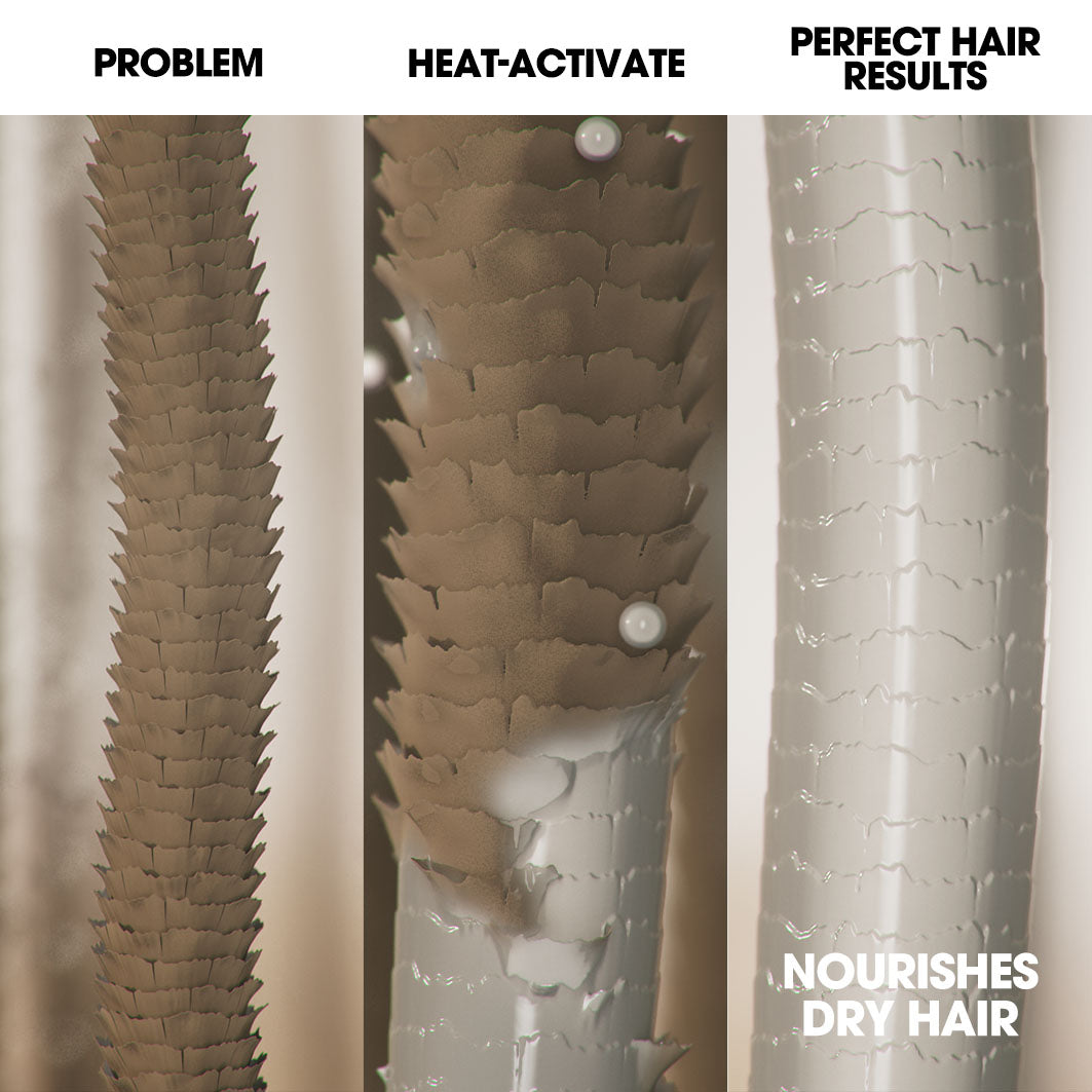 - Activeer de verzorging met warmte: droog het haar volledig en gebruik een verwarmde ghd tool om de werking te maximaliseren.