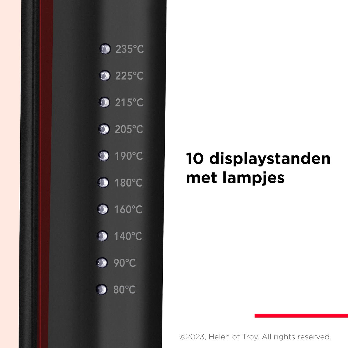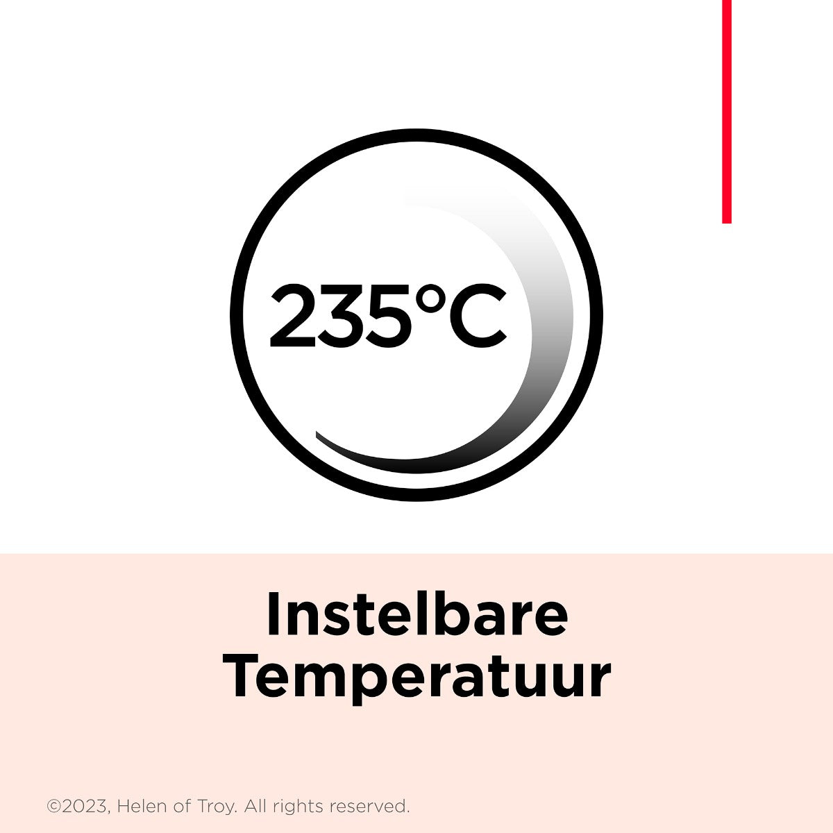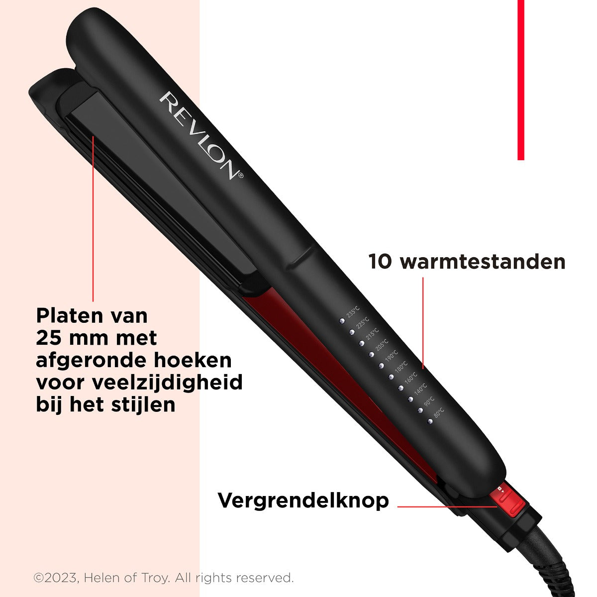 De Revlon 25 mm Smoothstay Straightener is ontworpen om je haar gladder en gezonder te maken. Deze straightener beschikt over keramische platen met kokosolie-infusie, wat resulteert in gladder en gezonder haar. De straightener maakt gebruik van ionische technologie met keramiek en toermalijn, wat zorgt voor een kortere behandeling en zijdezachte resultaten. Met instelbare temperatuur tot 235 graden kun je de perfecte hitte-instelling kiezen voor jouw haartype. Bovendien heeft deze straightener 10 displaystanden met lampjes en staven met 3 keramische lagen met kokosolie-infusie, waardoor je haar pluisvrij blijft.