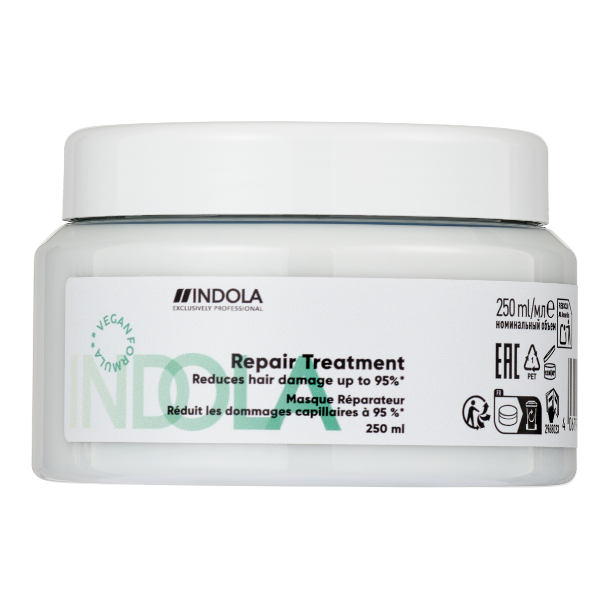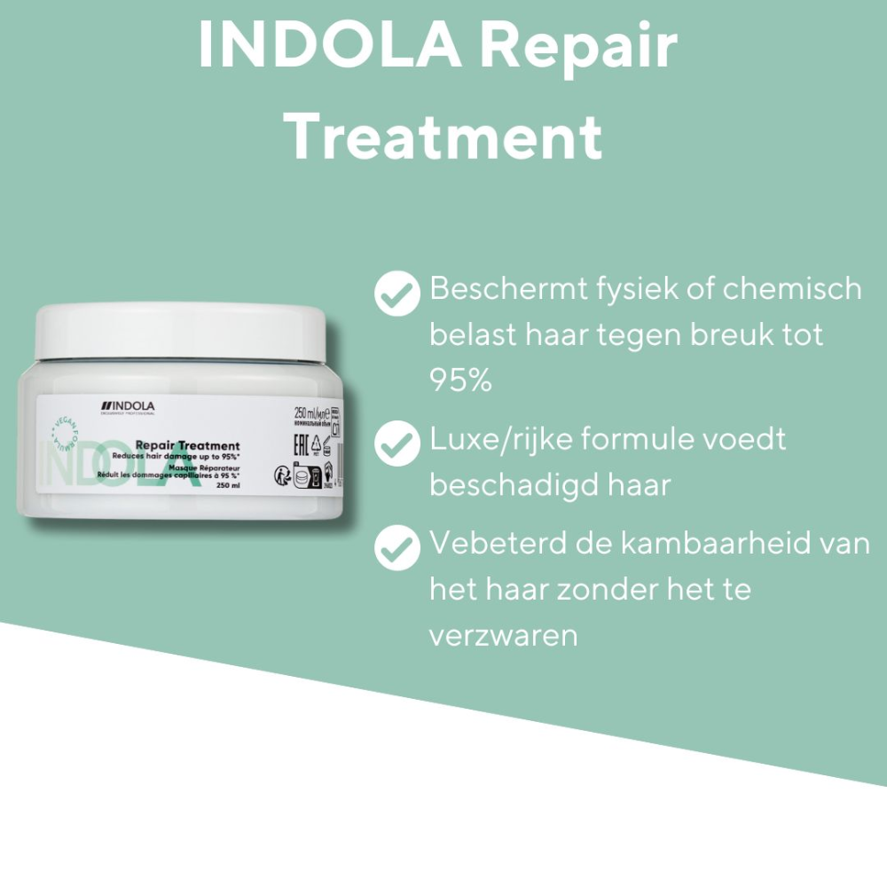 De Indola Treatment Repair herstelt de haarvezel van binnenuit. De treatment bevat een formule met Pixel Technologie, wat het haar terugbrengt naar de natuurlijke conditie. Daarnaast zorgt Marula Olie ervoor dat het haar herstelt en intens gevoed wordt. Na gebruik van het masker heeft het haar weer een glanzende en levendige kleur.