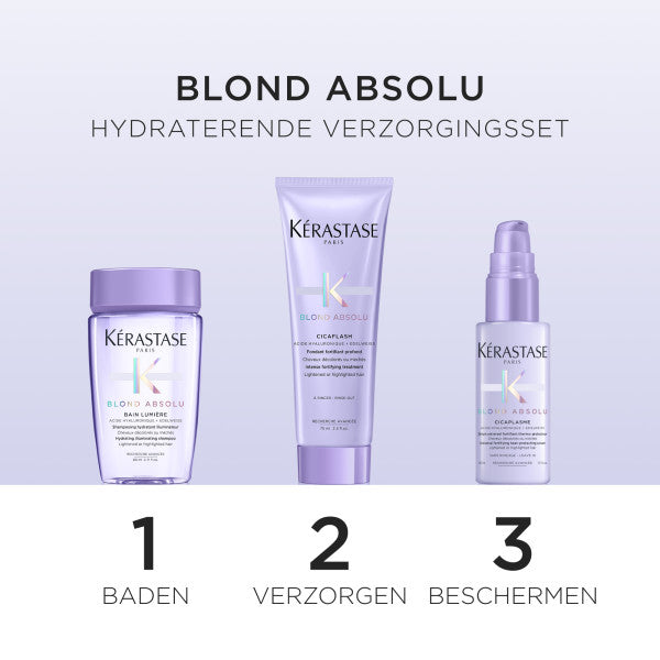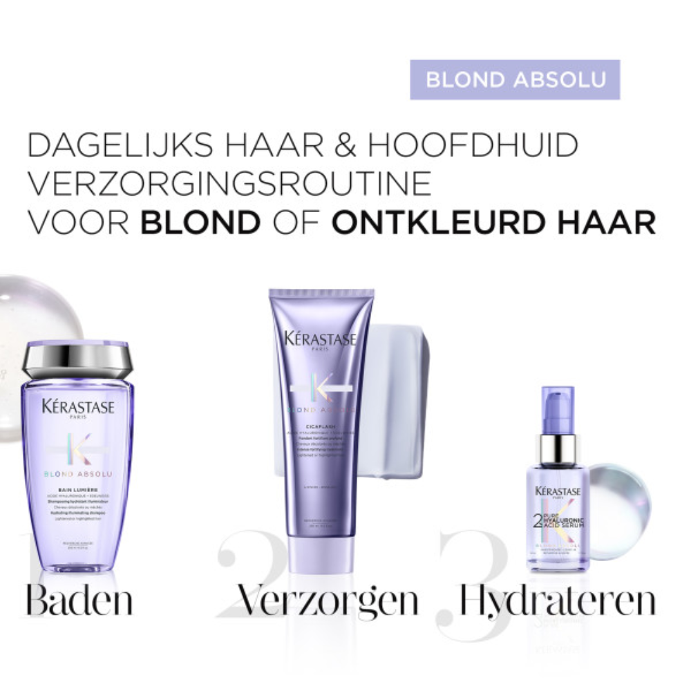 • Voor een perfecte dagelijkste verzorging van blond en geblondeerd haar was je je haar met de Kérastase Blond Absolu Bain Lumière Shampoo in combinatie met de Cicaflash Conditioner. Vervolgens kan je het Cicaplasme Hittebeschermer aanbrengen op handdoekdroog haar. Dit serum is tevens een hittebeschermer, je kunt je haar nu dus veilig stylen!