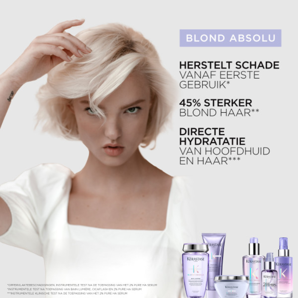 Kérastase Blond Absolu is de beste verzorging voor iedere blondine. Kérastase biedt producten voor grijsblond haar maar ook voor caramelblond haar. Ook wanneer je blonde highlights hebt ben je bij Blond Absolu aan het juiste adres. Deze collectie is gericht op alle types gebleekt of geblondeerd haar en biedt verschillende maten van kleurcorrectie. Zo zijn er twee verschillende shampoos te vinden in de collectie, de Bain Lumiere Shampoo is voor iedere blondine te gebruiken en zorgt voor hydratatie en glans. De Bain Ultra-Violet Shampoo is een zilvershampoo speciaal voor iedereen die het haar een extra koele gloed wil geven. Daarnaast bevat de Blond Absolu lijn een conditioner die intensieve verzorging biedt maar ook een ultra-violet masker met progressieve resulaten wat actief koperkleur in het haar tegengaat.