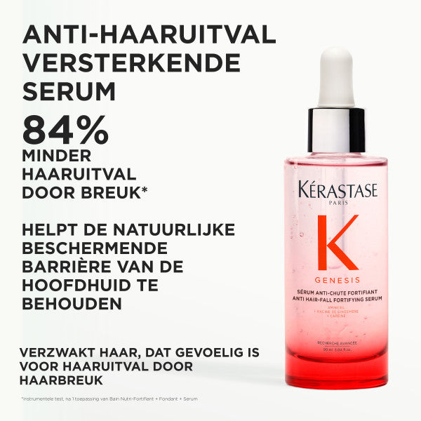 Het Kérastase Genesis Sérum Anti-Chute Fortifiant Haarserum is een versterkend serum voor zwak haar dat gevoelig is voor haaruitval als gevolg van breuk. Het anti-haaruitval serum verbetert de weerstand van het haar waardoor haaruitval wordt geminimaliseerd en mooi haar wordt gemaximaliseerd. Het serum zorgt ervoor dat de zakjes steviger in de hoofdhuid worden verankerd zodat het in de toekomst beter kan groeien en haarbreuk wordt voorkomen.