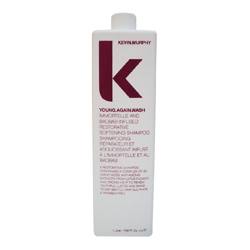 Kevin Murphy Young.Again.Wash Shampoo zorgt ervoor dat het haar jong blijft en zijn glans behoudt. De herstellende shampoo bevat 20 aminozuren. Lotusbloem en orchidee extracten herstellen het haar van natuurlijke en chemische aging. De shampoo geeft glans aan droog en broos haar. De shampoo zal het haar voorbereiden om voedende ingrediënten van de rinse en masque op te nemen.
