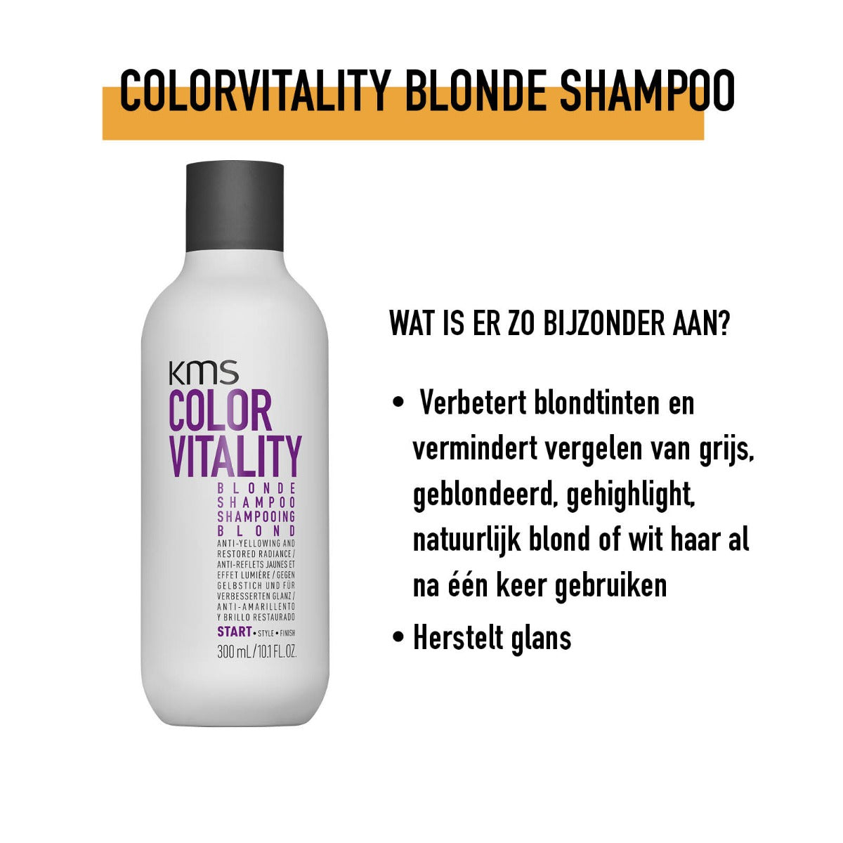 Shampoo die blondtinten verbetert en vergelen vermindert na één wasbeurt. KMS Hair colorvitality blonde shampoo is speciaal ontwikkeld voor mensen die blond haar hebben. De shampoo verbetert blondtinten en vermindert vergelen van grijs, geblondeerd, gehighlight, natuurlijk blond, grijs of wit haar al na één keer gebruiken. De diep reinigende shampoo herstelt de lichte kleur en de glans.