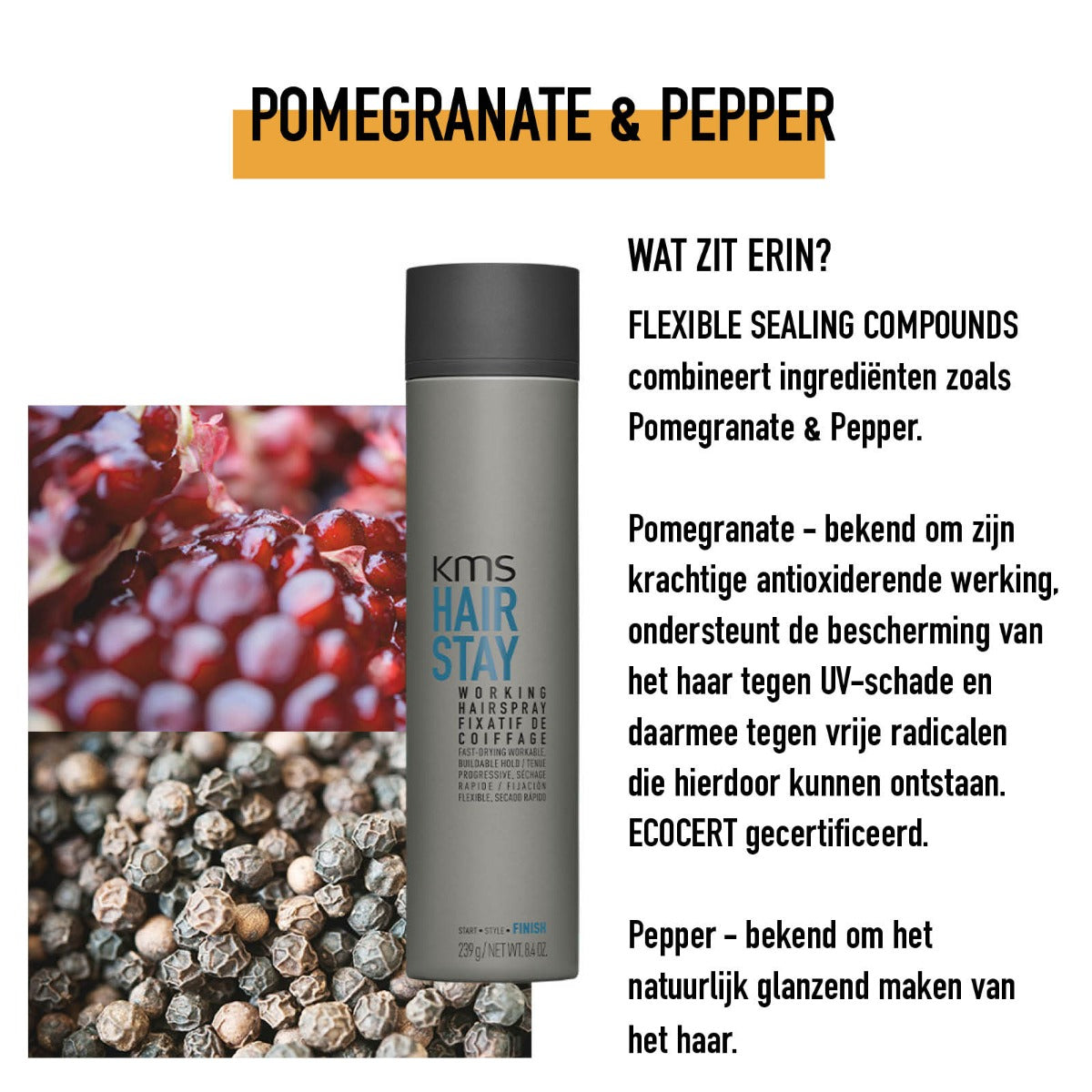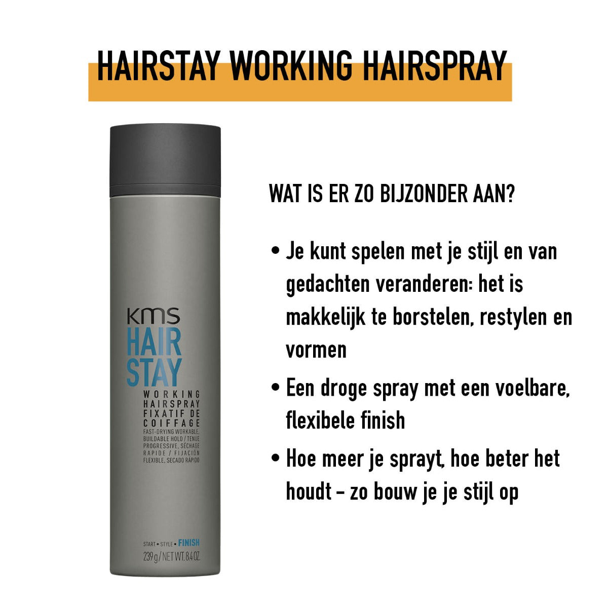 Met de KMS Hair Hairstay Working Hairspray kun je het haar naar elk model restylen en bewerken. Een stevige hold die opbouwend werkt en daardoor perfect blijft zitten