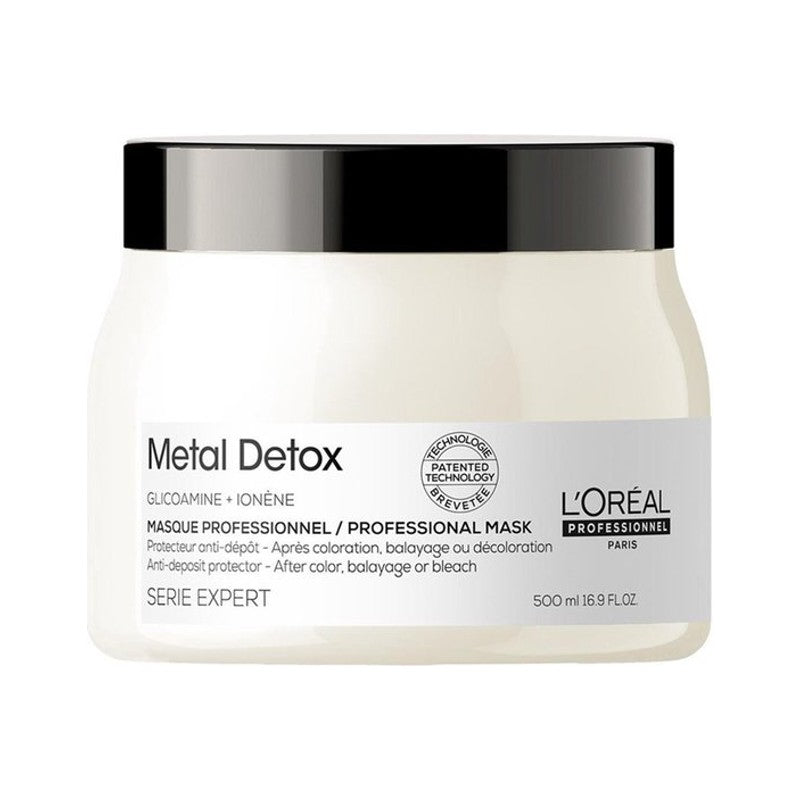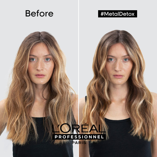 De L'Oréal Professionnel Serie Expert Metal Detox Haarmasker beschermt de haarvezel tegen metaaldeeltjes na een kleuring, ontkleuring of balayage. Iedere keer wanneer jij je haren wast kunnen metaaldeeltjes, aanwezig in water, zoals koper, je haarvezels binnendringen. Deze kunnen de haarvezel aantasten, de kans op haarbreuk vergroten en kleurverandering veroorzaken. Het Metal Detox Masker is het eerste anti-metaal, beschermende masker voor na een kleuring, balayage of ontkleuring. Na gebruik ziet het haar er gezonder uit en heeft het een prachtige glans. De formule bevat 10% glicoamine, dit molecuul is klein genoeg om de vezel binnen te dringen om daar metaal te verwijderen. De unieke producten van Metal Detox zorgen voor optimaal kleurbehoud en glanzender haar. De haarvezels worden versterkt en zijn beter bestand tegen afbreken. Het haar is gladder en 72 uur lang gevoed met een kenmerkende topnoot van muskusachtige houtsoorten.