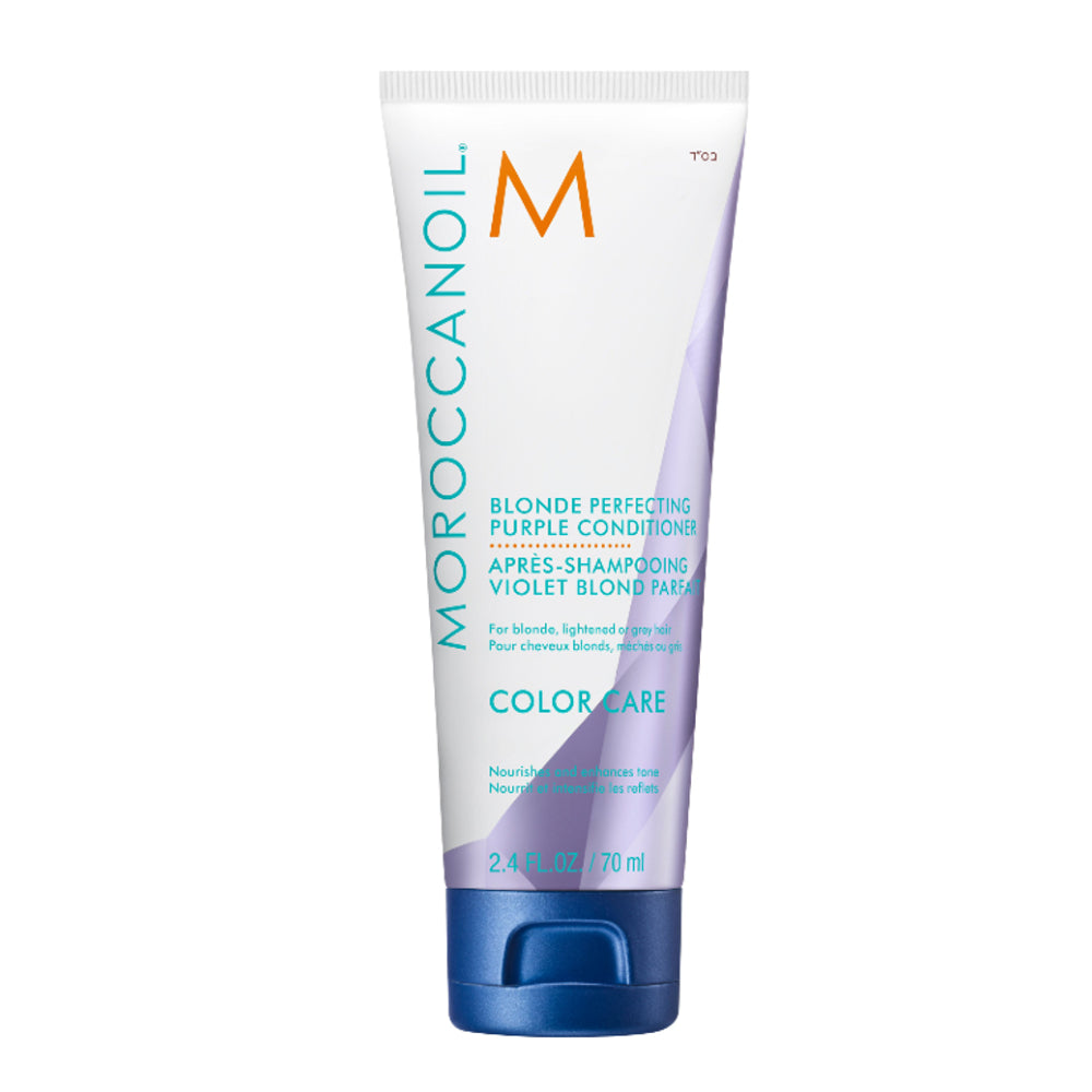 Moroccanoil Blonde Perfecting Purple Conditioner is een kleurcorrigerende conditioner met violette pigmenten tegen ongewenste gele en oranje tinten in blond, lichter bruin en grijs haar. De conditioner bevat ArganID technologie, om de haarschubben te helpen herstellen en verzegelen, plus een ontwarrend aminozuurmengsel om de kleur te beschermen en glans te versterken.