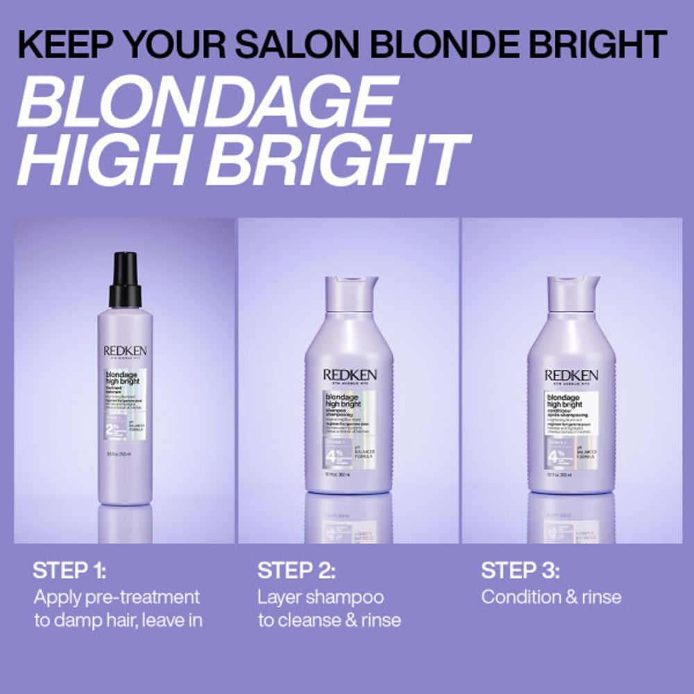 Dit product verfrist balayages, gekleurd & gehighlight haar. De conditioner bevat Vitamine C en Brightening Care Complex om onzuiverheden die het haar donkerder, dof en mat maken, te verwijderen. Hierdoor wordt de haarkleur weer licht, stralend en helder. De conditoiner biedt daarnaast extra verzorging en maakt het haar verzorgd en glanzend. We raden aan de conditioner in combinatie te gebruiken met de Redken Blondage High Bright Shampoo en de Pre-Treatment. Hoe vaker je deze routine gebruikt, hoe helderder de resultaten. Na gebruik van de High Bright routine is je haar weer net zo fris en blond als wanneer je net van de kapper komt!