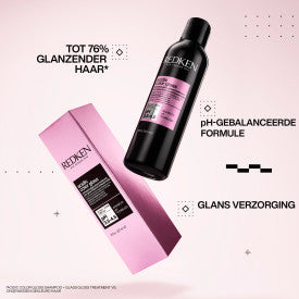 De Glass Gloss Treatment is niet alleen Redken's eerste salon-geïnspireerde glansbehandeling voor thuisgebruik, maar ook een essentiële stap voor iedereen die de levendigheid van zijn haarkleur wil verlengen of simpelweg zijn haar een schitterende glans boost wil geven. Dankzij de unieke formule met een zure pH-waarde, waterstofperoxide en abrikozenolie, wordt je haar beschermd tegen doffe kleuren en krijgt het een intense glans. Deze ingrediënten sluiten de haarschubben, behouden de glans diep in het haar en brengen de pH-waarde van het haar in evenwicht. Het resultaat? Een adembenemende glans, pluisvrij haar dat er gerevitaliseerd uitziet en voelt.