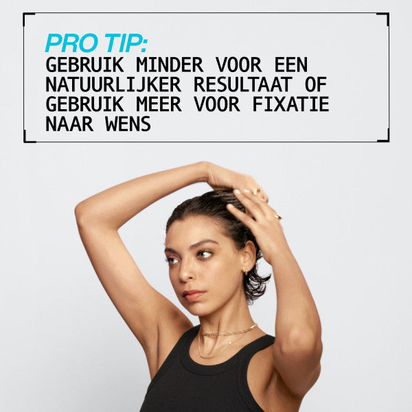 Verdeel de Redken Texturize Styling Rewind over je handen en verspreid het product met gespreide vingers over het haar, zodat losse vezels op het haar vallen. Ga met je vingers door het haar om een warrige textuur te creëren.