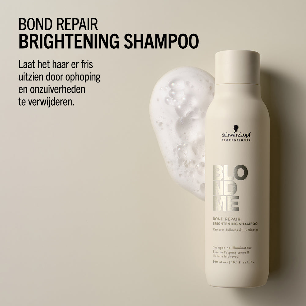 Schwarzkopf Professional BlondMe Bond Repair Brightening Shampoo met BOND REPAIR TECHNOLOGY reinigt blond haar op milde wijze en verwijdert build-up, onzuiverheden en milieuverontreinigende stoffen. De formule verheldert het haar visueel en helpt de haarstructuur te versterken, waardoor schade die gelijk staat aan twee oplichtingsbehandelingen wordt hersteld. Verrijkt met amandelolie en witte thee, hydrateert deze shampoo het haar zonder te verzwaren en laat het soepel en glanzend achter.